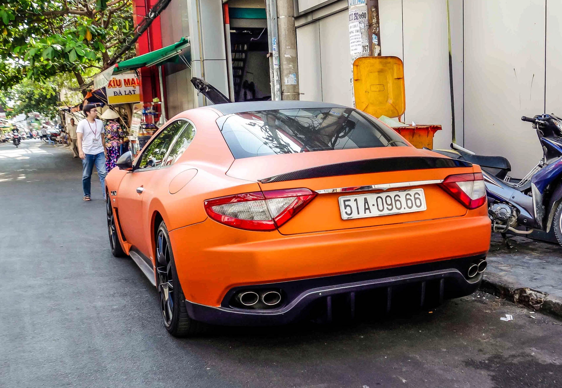Siêu xe Maserati Granturismo đ ược dán decal màu cam khá lạ mắt. Trước đây, chiếc xe có màu trắng và được độ body MC Stradale. |
