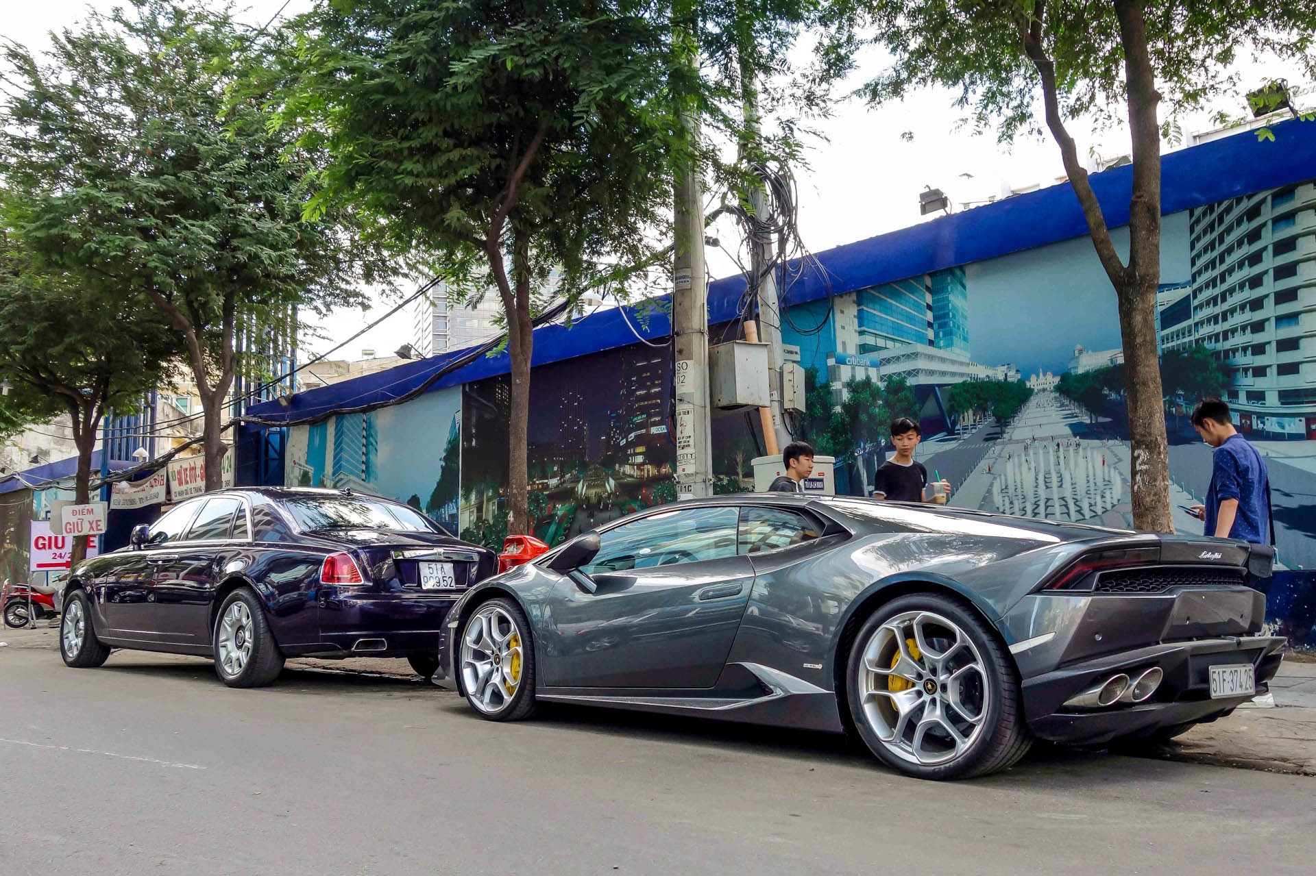 Lamborghini Huracan chính hãng đầu tiên tại Việt Nam sánh đôi cùng xe siêu sang Rolls-Royce Ghost. Giá của Huracan vào khoảng 13,5 tỷ đồng (chưa tính thuế trước bạ), trong khi Rolls-Royce Ghost khoảng 16 tỷ đồng. |