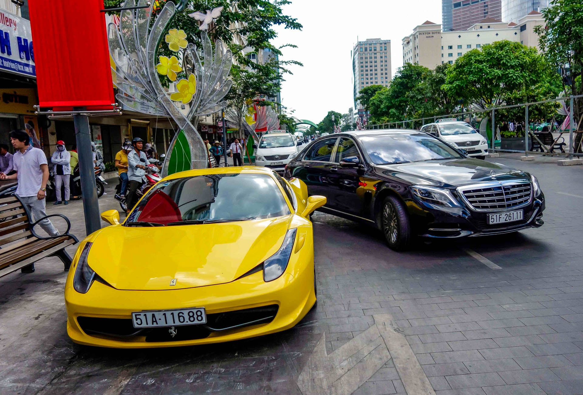 458 Italia màu vàng nổi bật bên cạnh Mercedes Maybach S600. |
