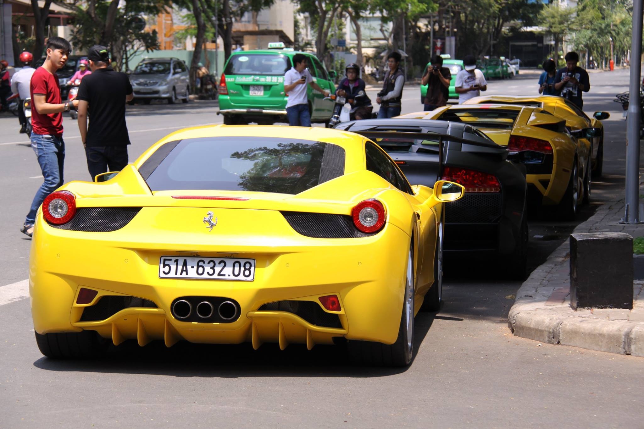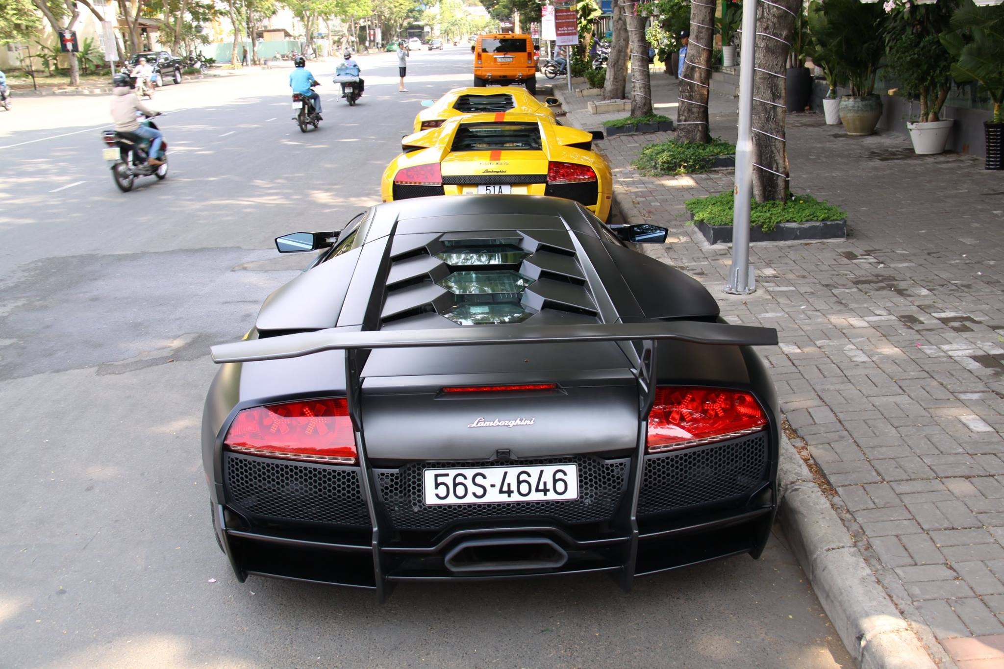 | Lamborghini Murcielago LP640 màu vàng (ở giữa) cũng là chiếc xe được chú ý tại Sài Gòn. Chiếc xe này được nhập về Việt Nam vào tháng 3/2011. LP640 sử dụng động cơ V12 6.5L, công suất tối đa 640 mã lực. Xe chỉ mất 3,4 giây để tăng tốc từ 0-100 km/h. Mới đây, chủ nhân của nó đã độ lại bằng việc thêm viền dán một sọc đỏ lớn chạy dọc mui xe với đường chỉ chrome ở giữa, mạ chrome ở cản trước và thêm dòng chữ “life to ride” ở đuôi. |