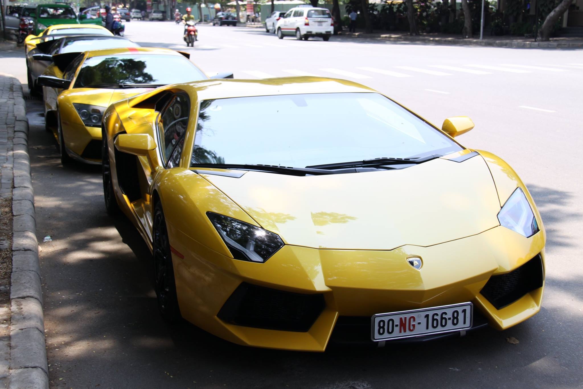 | Một siêu xe đời mới của Lamborghini cũng có mặt trong đoàn xe này là Lamborghini Aventador màu vàng mang biển số ngoại giao. Đây là một trong số hai chiếc Aventador đang được lưu hành tại Việt Nam. Siêu xe được trang bị động cơ V12 6.5 lít, công suất tối đa 700 mã lực và mô-men xoắn cực đại 690 Nm. Nó có thể tăng tốc từ 0-100 km/h trong vòng chưa tới 3 giây, trước khi đạt tốc độ tối đa 350 km/h. |