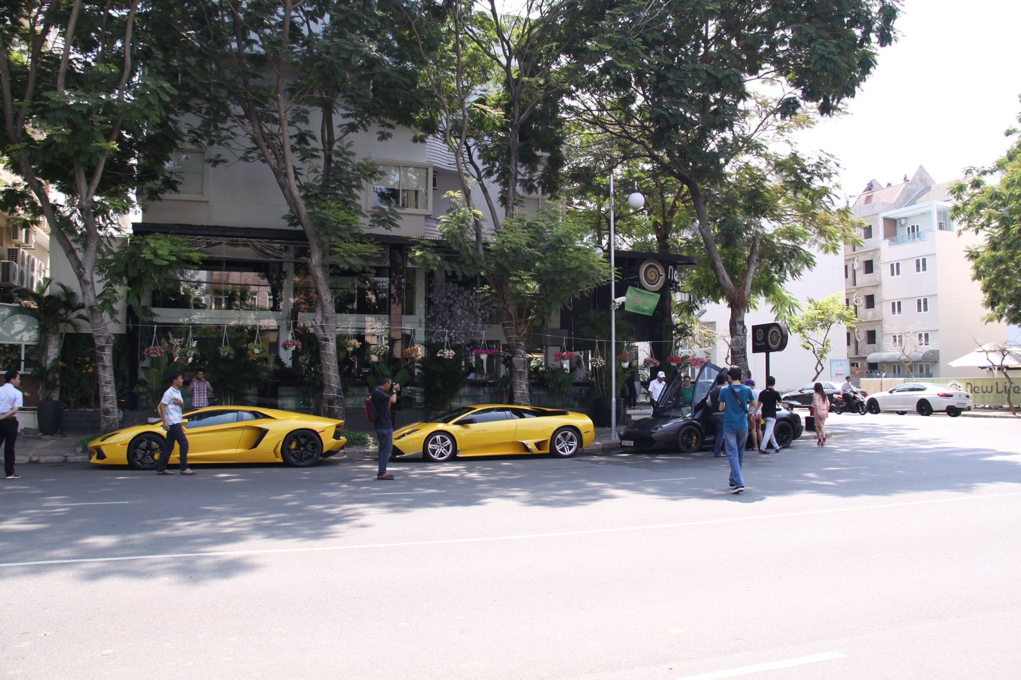 Vào trưa 4/3, dàn siêu xe gồm 4 chiếc Lamborghini, một chiếc Ferrari 458, một chiếc Hummer H2 đã có buổi gặp mặt tại một quán cà phê ở quận 7, TP.HCM.