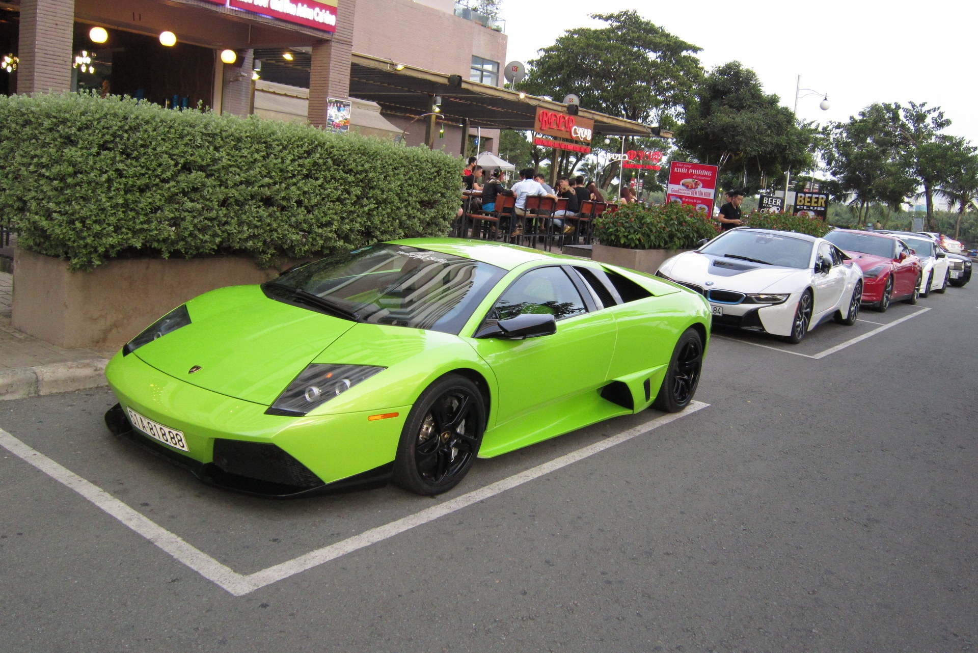 | Siêu xe Lamborghini Murcielago LP640 màu xanh cốm độc nhất Việt Nam cũng xuất hiện. Sau khi về chủ mới, líp cản trước được dán màu đen, cùng phong cách với mâm xe. |