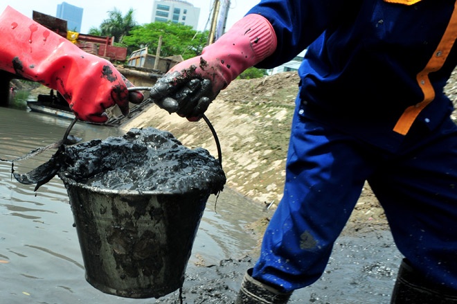Tuy nhiên với họ niềm vui lớn nhất là giúp thông suốt các dòng chảy và làm xanh sạch đẹp môi trường. Mỗi một xô bùn như một sản phẩm ra lò của các anh chị. |