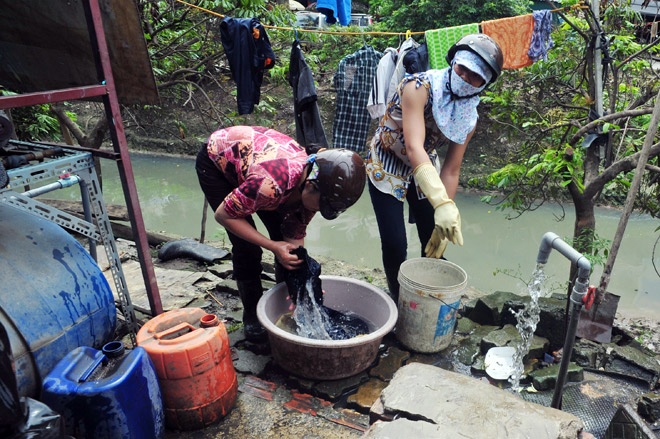 Còn cánh đàn ông thì tranh thủ tiện đâu rửa mặt đấy, thậm chí là nước trong xe bồn. |