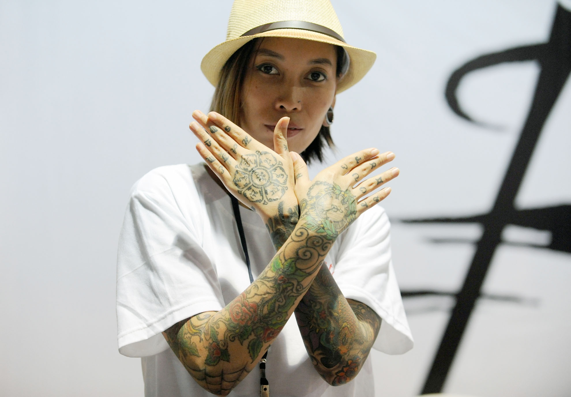 | Vieky Maunsell, 25 tuổi, thợ xăm đến từ TP.HCM với những mảng hình kín hai cánh tay. Hình xăm vòng tròn trên mô bàn tay của Vieky là câu thần chú đạo phật, cầu bình an cho chính mình. |