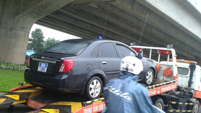 | Một xe biển xanh bị chết máy trên đường Nguyễn Xiển được xe cứu hộ chở đi. |