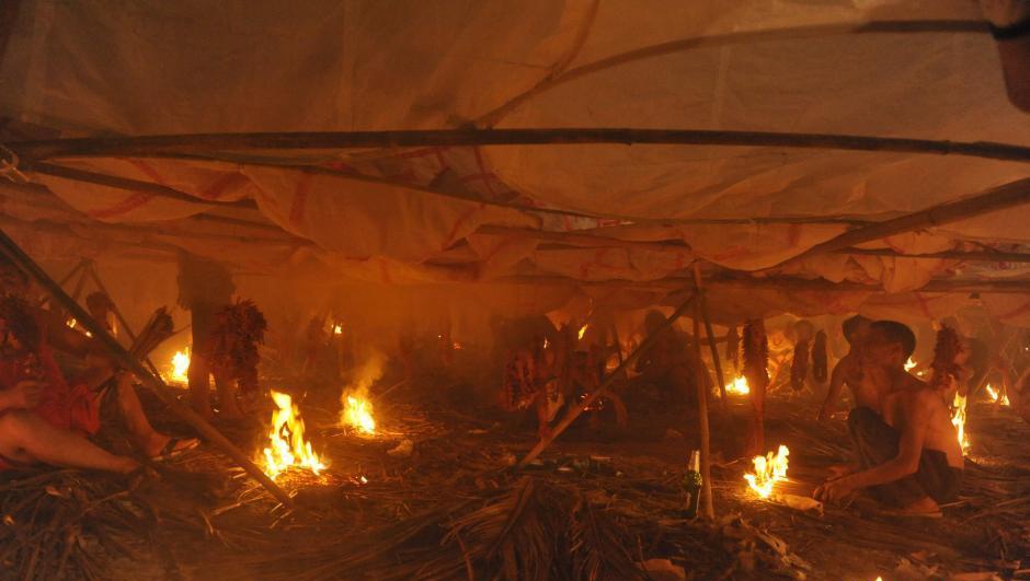 Trước khi châm lửa, người ta đặt đèn trời lên một chiếc khung bằng tre. |