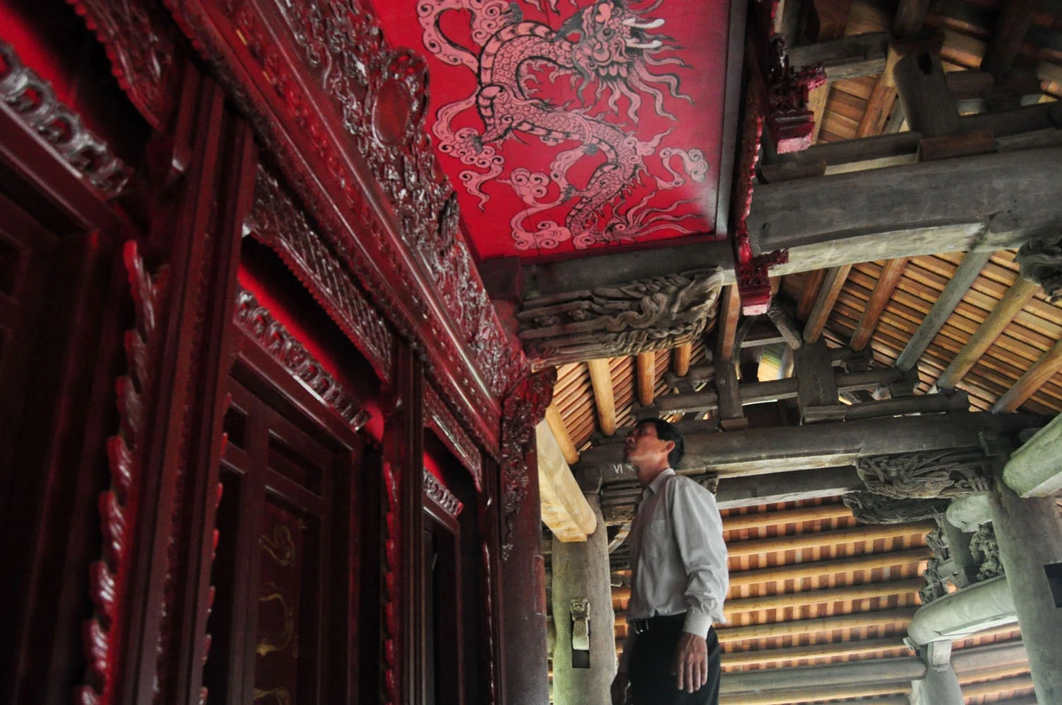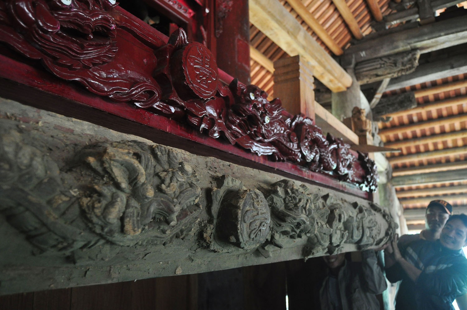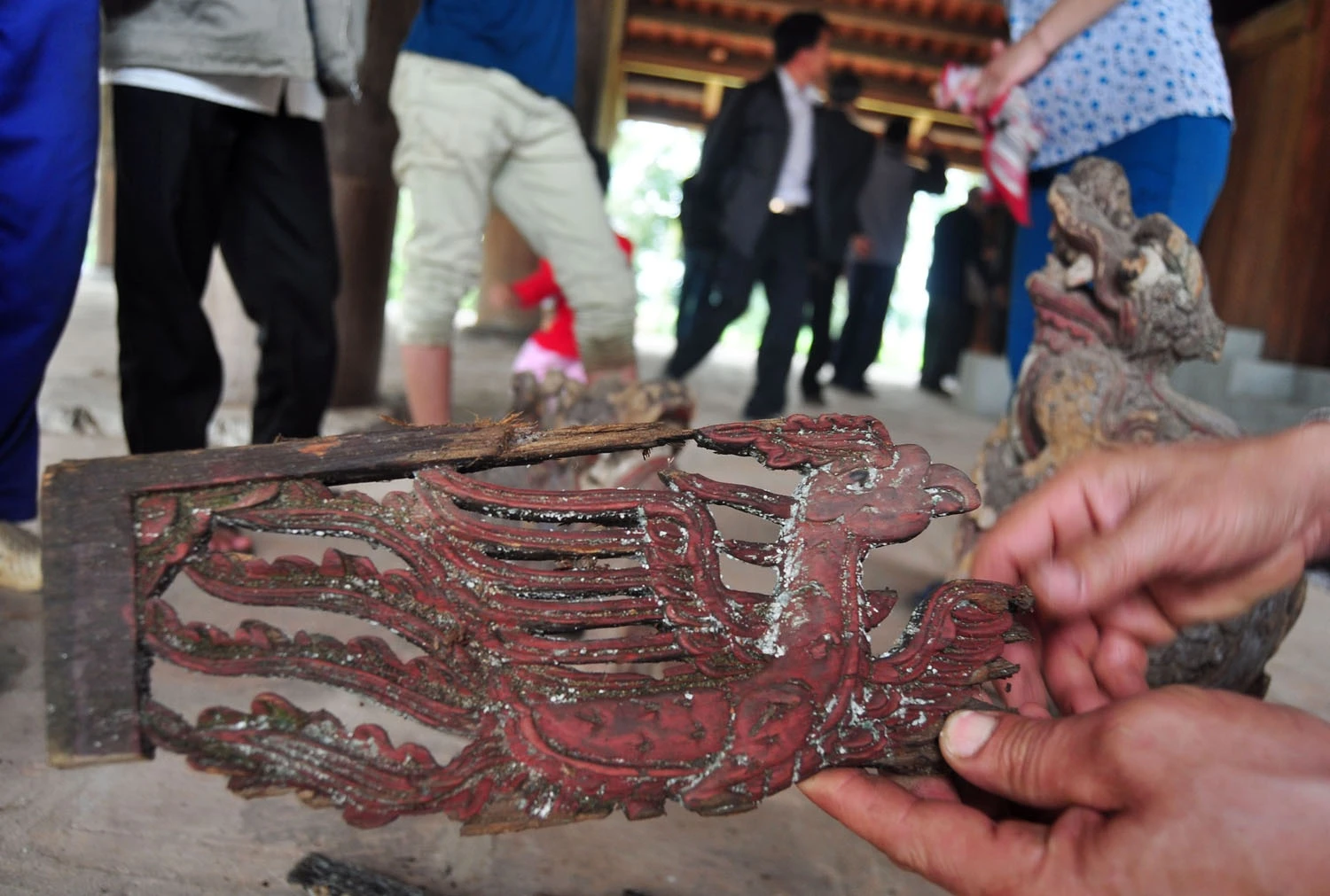 | Long, phụng được làm bằng gỗ vàng tâm, các họa tiết trang trí tỉ mỉ bị tháo dỡ và phơi mưa, nắng nhưng vẫn còn rất chắc chắn. |
