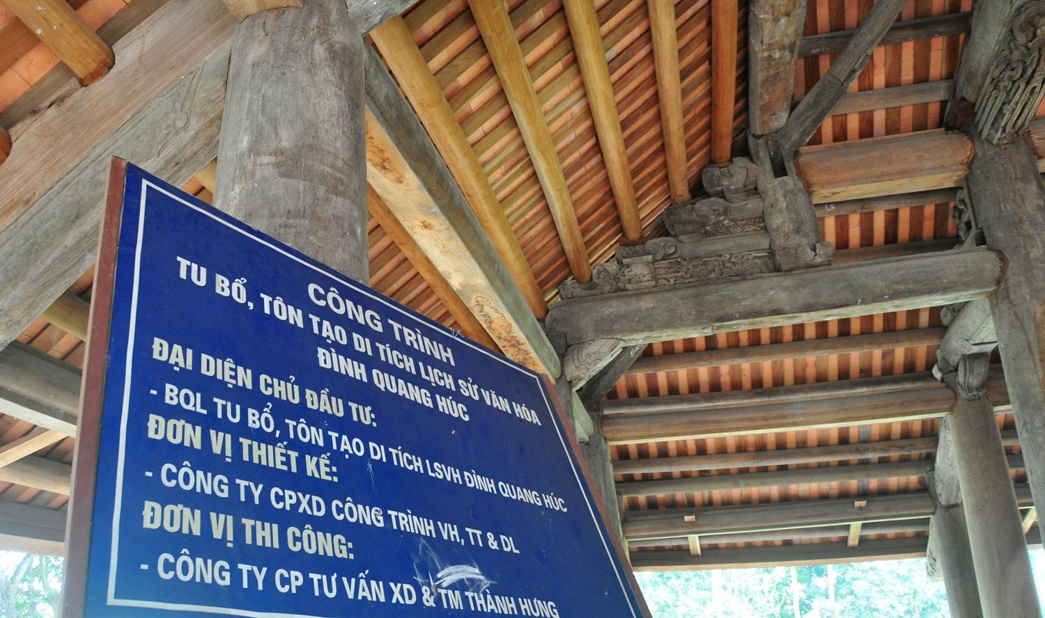 | Đại diện chủ đầu tư công trình là Ban quản lý tu bổ, tôn tạo di tích lịch sử văn hóa đình Quang Húc do Công ty cổ phần xây dựng công trình văn hóa, thể thao và du lịch thiết kế. Đơn vị thi công là Công ty cổ phần tư vấn xây dựng và thương mại Thành Hưng. |