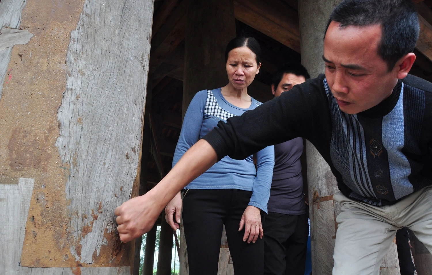 | Anh Long (38 tuổi) người làng vừa nói vừa dùng chìa khóa xe máy cạy mảng keo chắp vá vị trí cột bị mọt do đơn vị thi công mới làm. "Dùng bất cứ vật cứng nào cạy nó đều bở tung ra như vậy". |