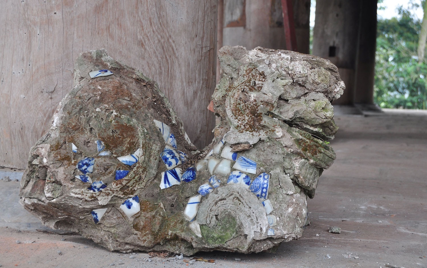 | Tạo hình linh vật được làm bằng vôi trộn mật gắn trên 4 góc khúc của mái đình bị dỡ xuống, thay thế bằng các con rồng xi măng xấu xí. |