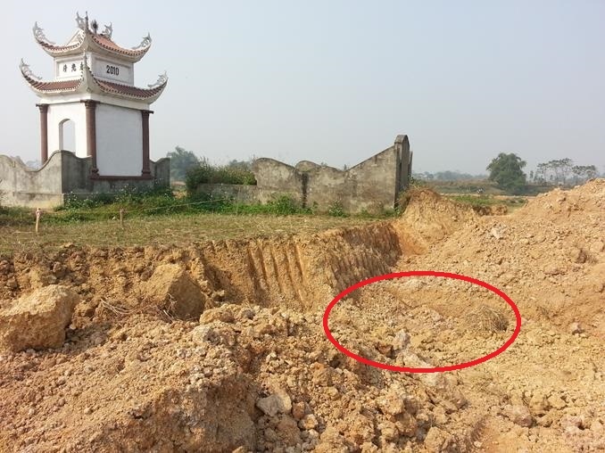 | Vị trí phát hiện con "ngựa cổ" ở vùng khoanh đỏ phía sau hai ngôi mộ thuộc gò Ngành Trê |