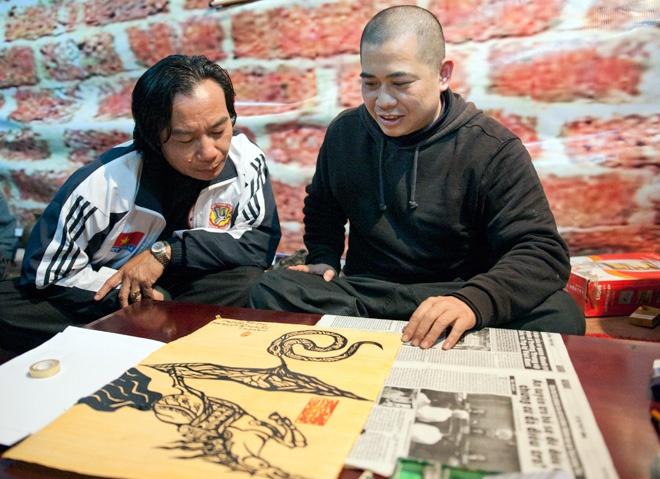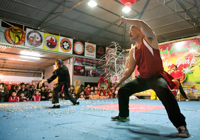 | Võ sư Phi Lân (áo đỏ) và võ sư Quang Tín thuộc Hội Võ thuật Hà Nội biểu diễn tại màn khai mạc. Thân pháp, quyền pháp của võ sư Phi Lân cứng rắn, chắc, mạnh mẽ còn võ sư Quang Tín uyển chuyển, dẻo dai. |