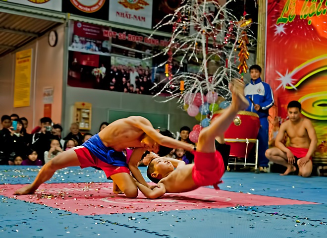 | Màn đấu vật của trẻ em xã Cát Quế, huyện Hoài Đức. Nơi đây được biết đến là một sới vật nổi tiếng thuộc Hà Tây cũ. Các bé trai từ nhỏ đã được ông, cha truyền cho những miếng vật gia truyền. |