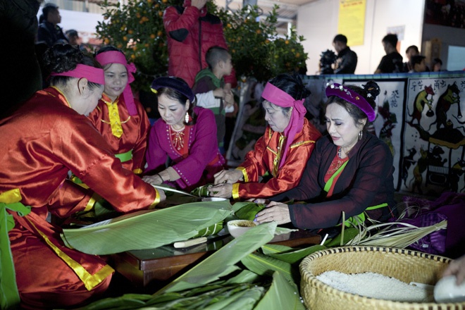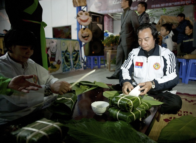 | Tiết mục thi gói bánh chưng giữa hai đội Ba Đình và Tây Hồ. |