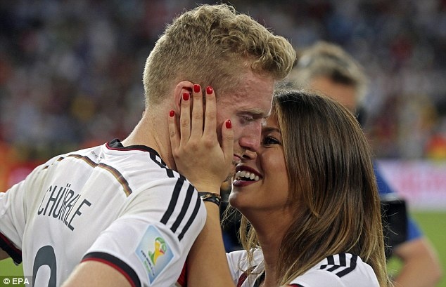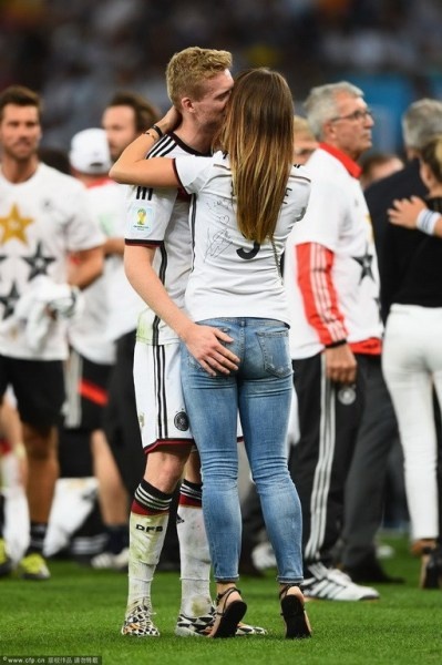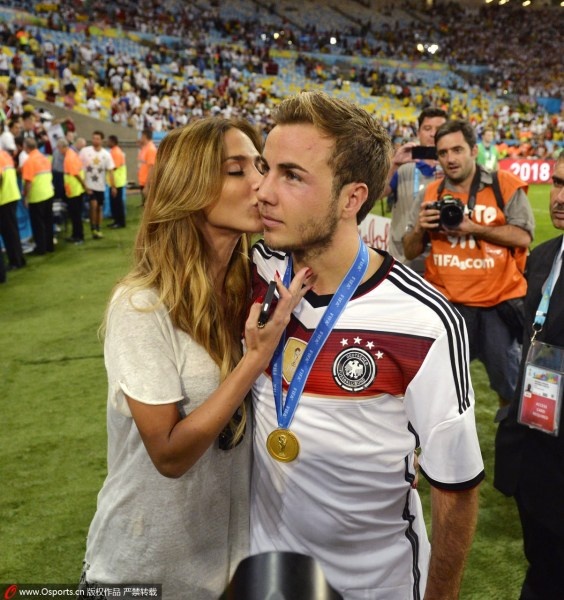 | Người hùng đêm chung kết Mario Goetze ăn mừng chiến thắng trong vòng tay của cô bồ xinh đẹp Ann Kathrin. |