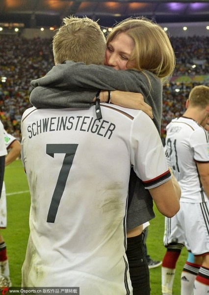 Siêu mẫu Đức Sarah Brandnern ôm chặt bạn trai Bastian Schweinsteiger sau chiến thắng. |