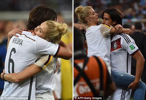 | Lena Gercke - bạn gái nóng bỏng của Sami Khedira không kìm được hạnh phúc, nhảy lên ôm hôn người đàn ông của mình. |