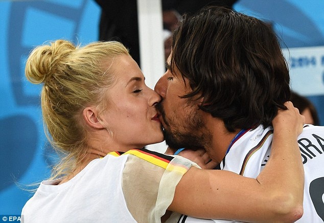 | Cầu thủ Mats Hummels cũng được cô bạn gái xinh đẹp Cathy Fische "thưởng nóng" một nụ hôn cháy bỏng. |