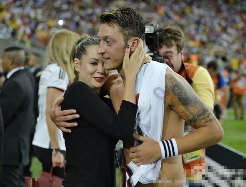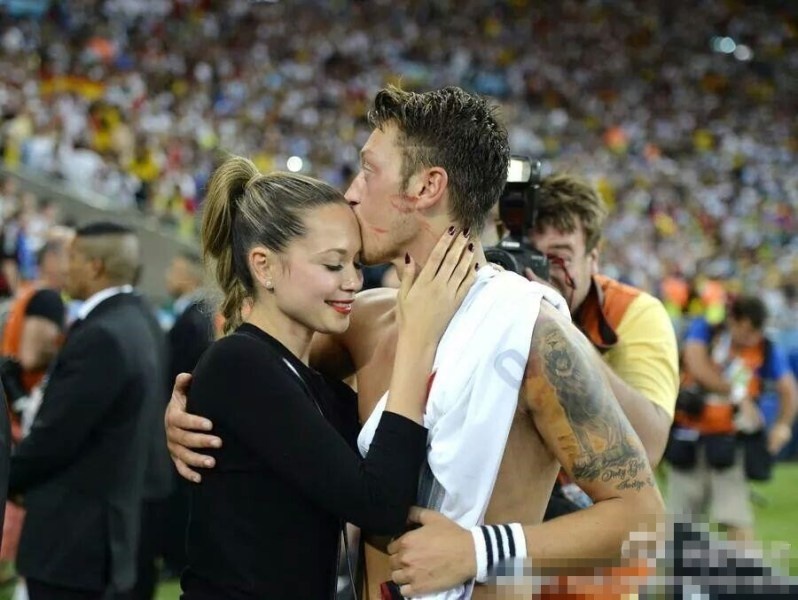 | Khuôn mặt của Oezil đầy dấu son môi - món quà tình yêu mà nữ ca sĩ Mandy Capristo trao tặng. |