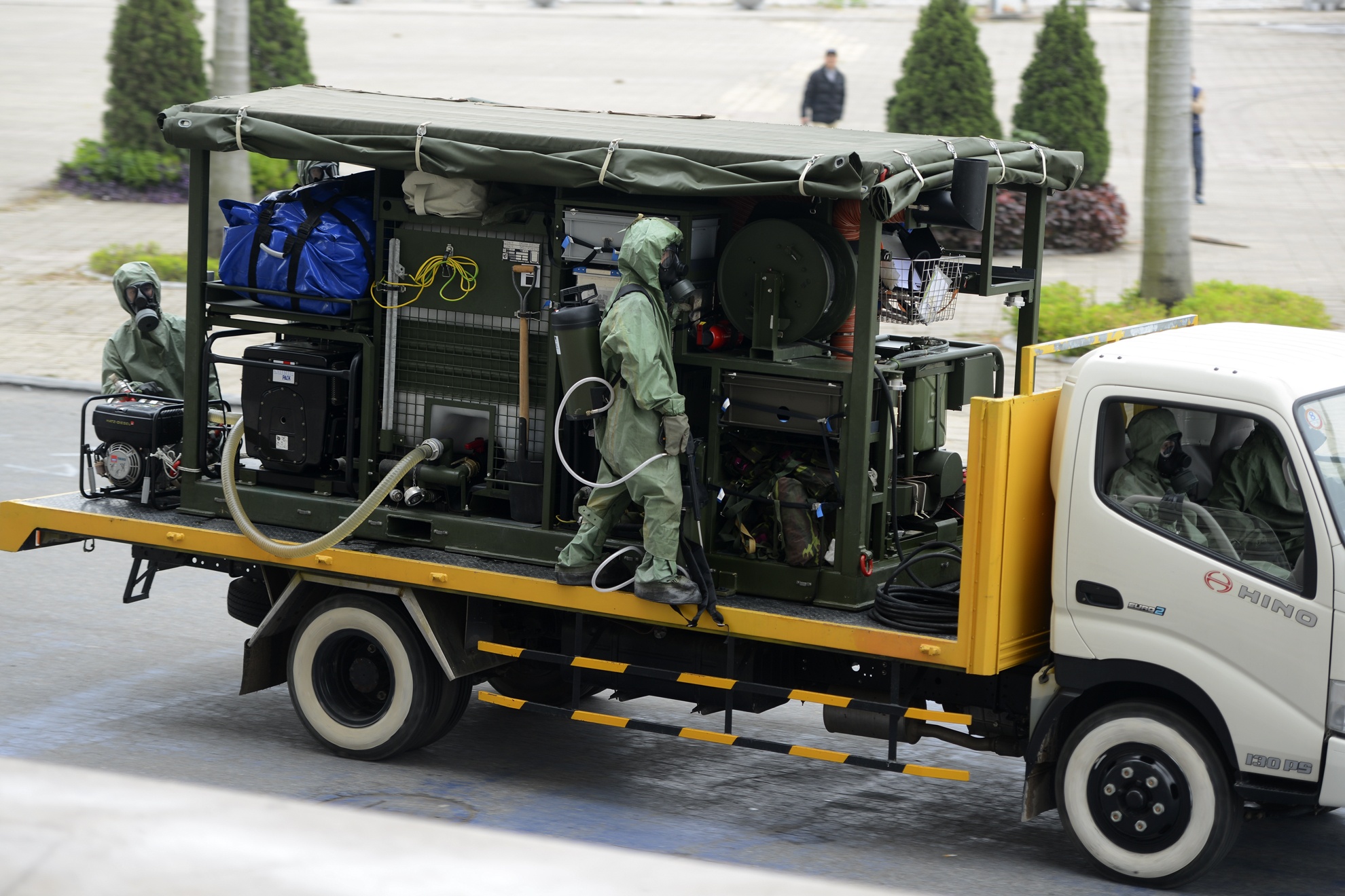 Lực lượng phòng hóa của Bộ Tư lệnh Thủ đô cũng có mặt. Đây là lực lượng tinh nhuệ, chuyên xử lý những tình huống khi có bom hóa học, cháy nổ xảy ra.
