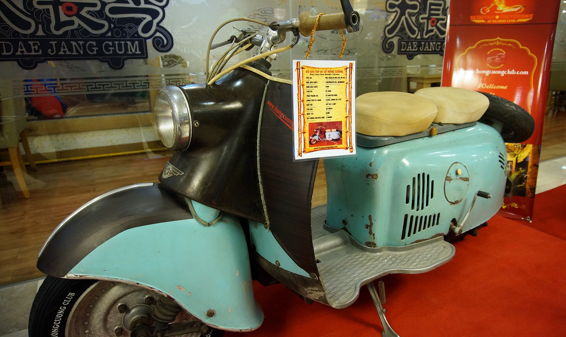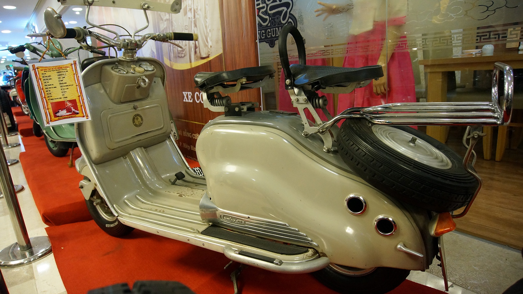 | Đây là mẫu Lambretta TV 175 của Ý, được sản xuất từ năm 1959, sử dụng động cơ 2 kì 175 cc. Xe đã được phục chế lại màu sơn và một vài chi tiết nhỏ. |