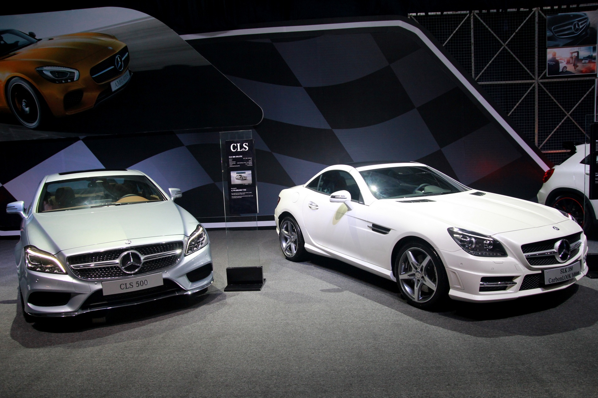 Xe thể thao SLK 350 bản đặc biệt CarbonLook Edition được trưng bày bên cạnh CLS 500 - chiếc coupe bốn cửa hạng sang trị giá 4,8 tỷ đồng.