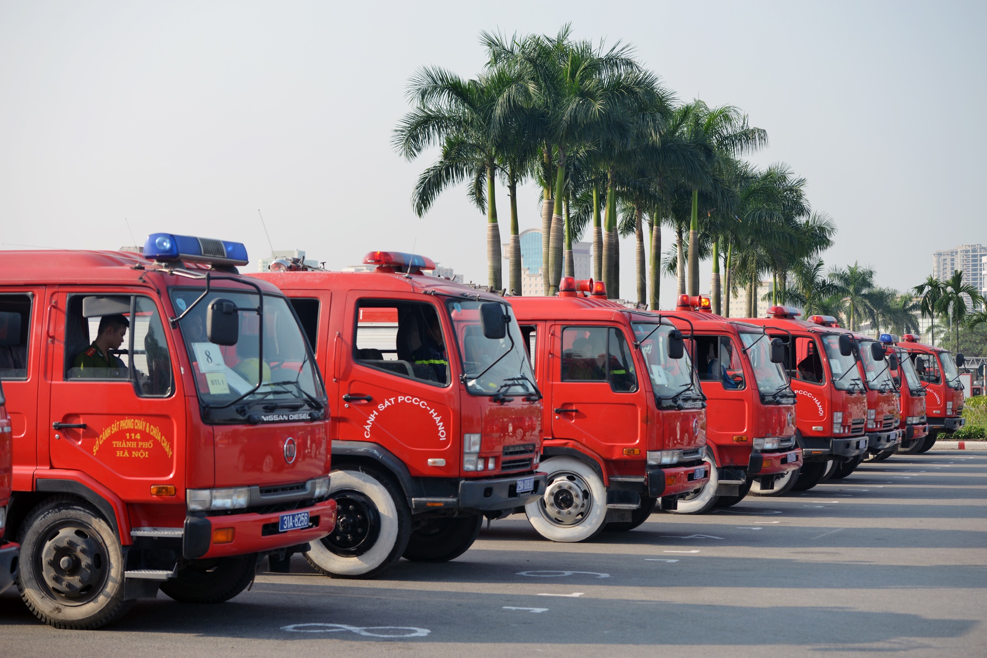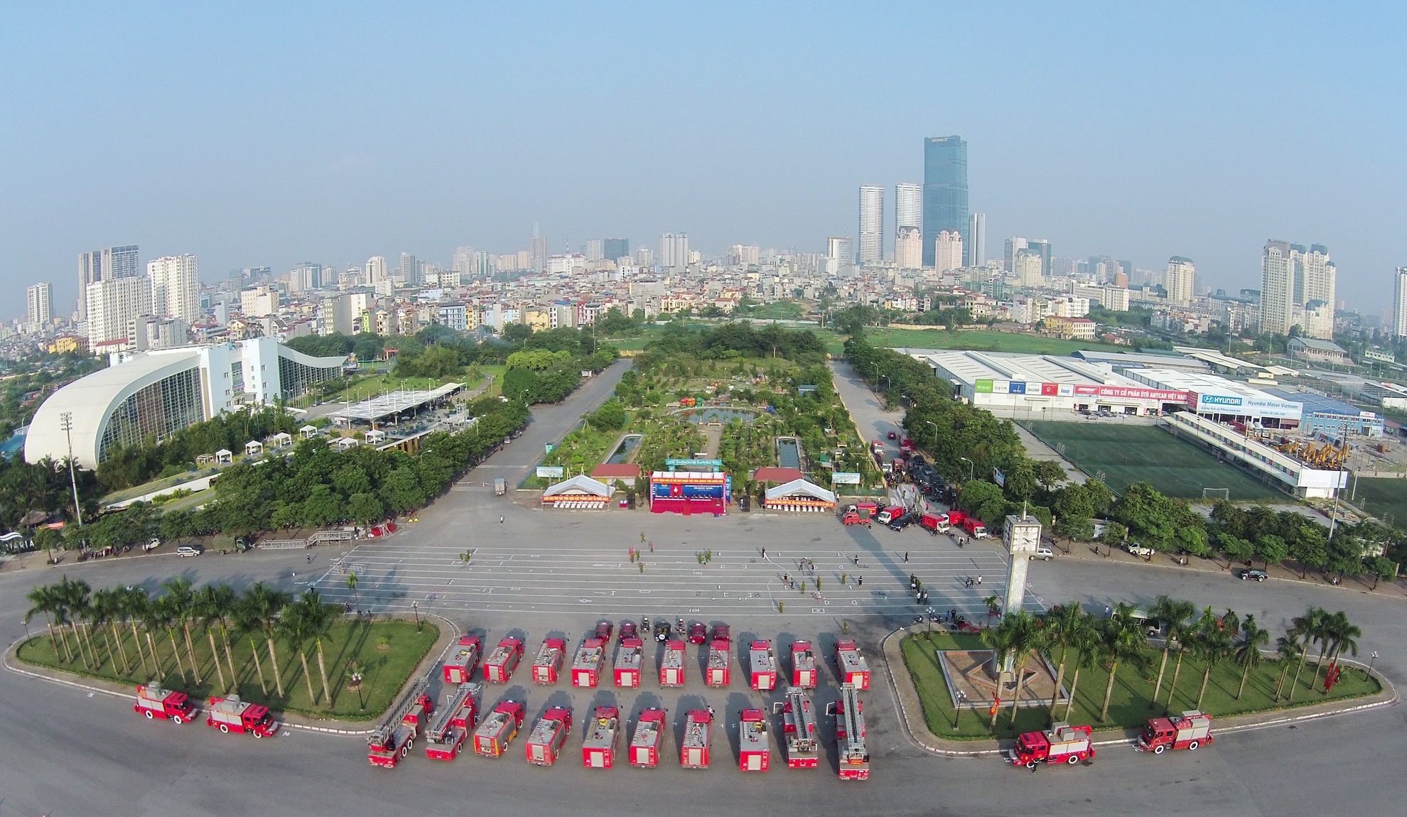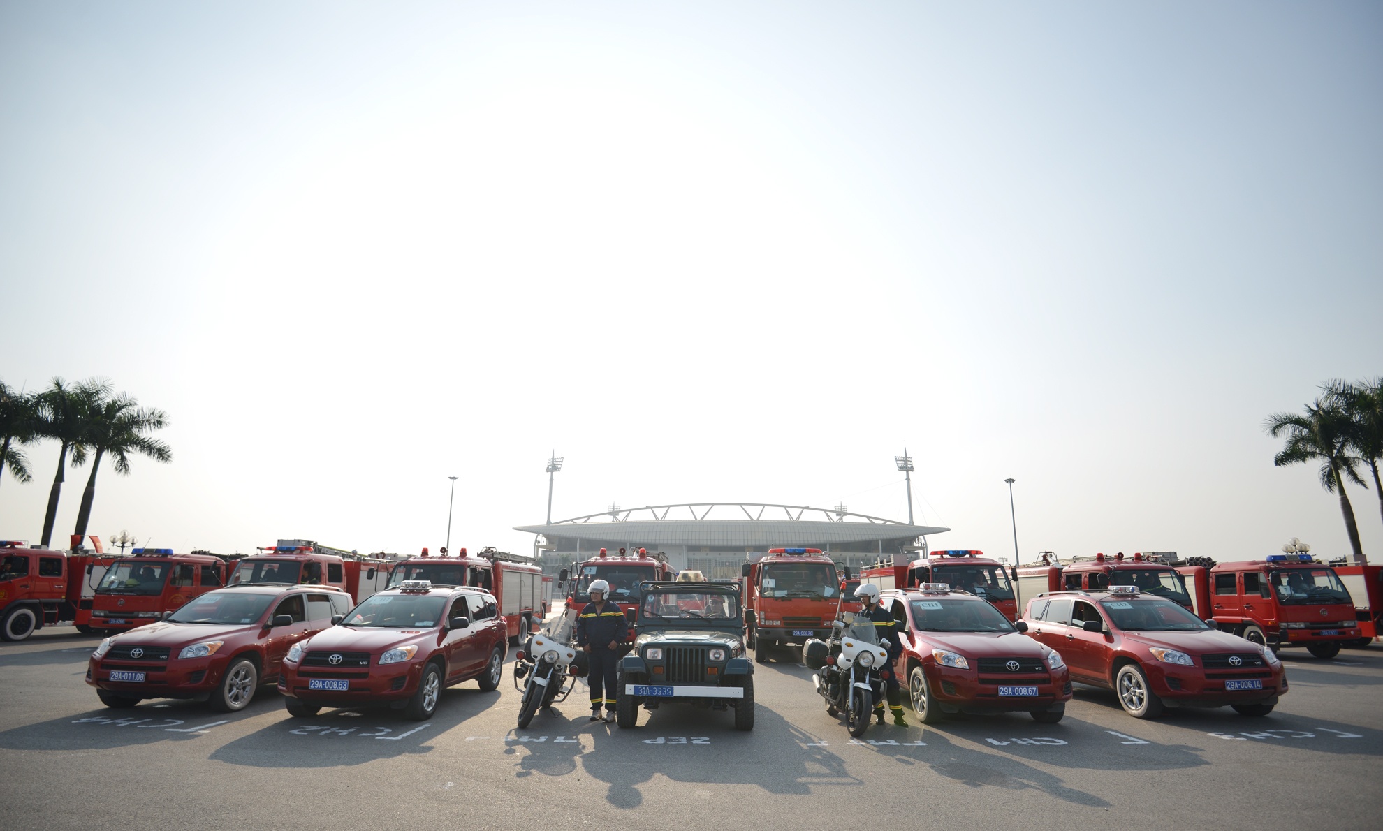| Các đoàn xe đặc chủng của Sở Cảnh sát Phòng cháy chữa cháy Hà Nội nối đuôi nhau trên quảng trường SVĐ Mỹ Đình. |