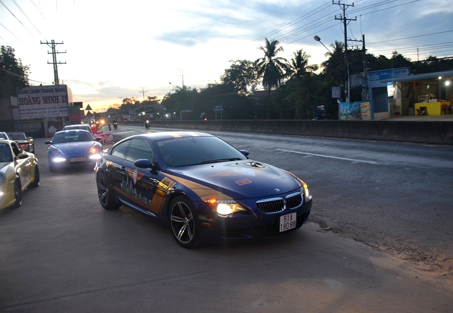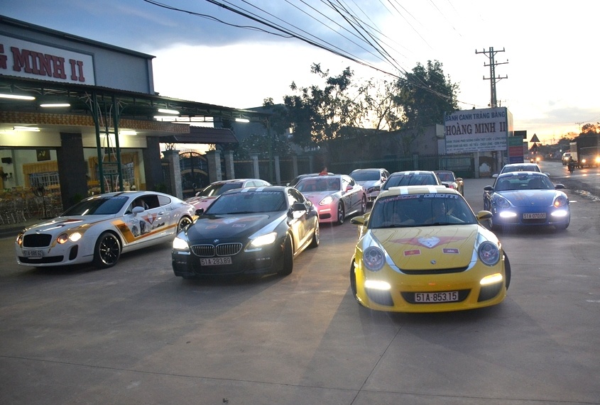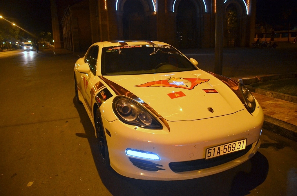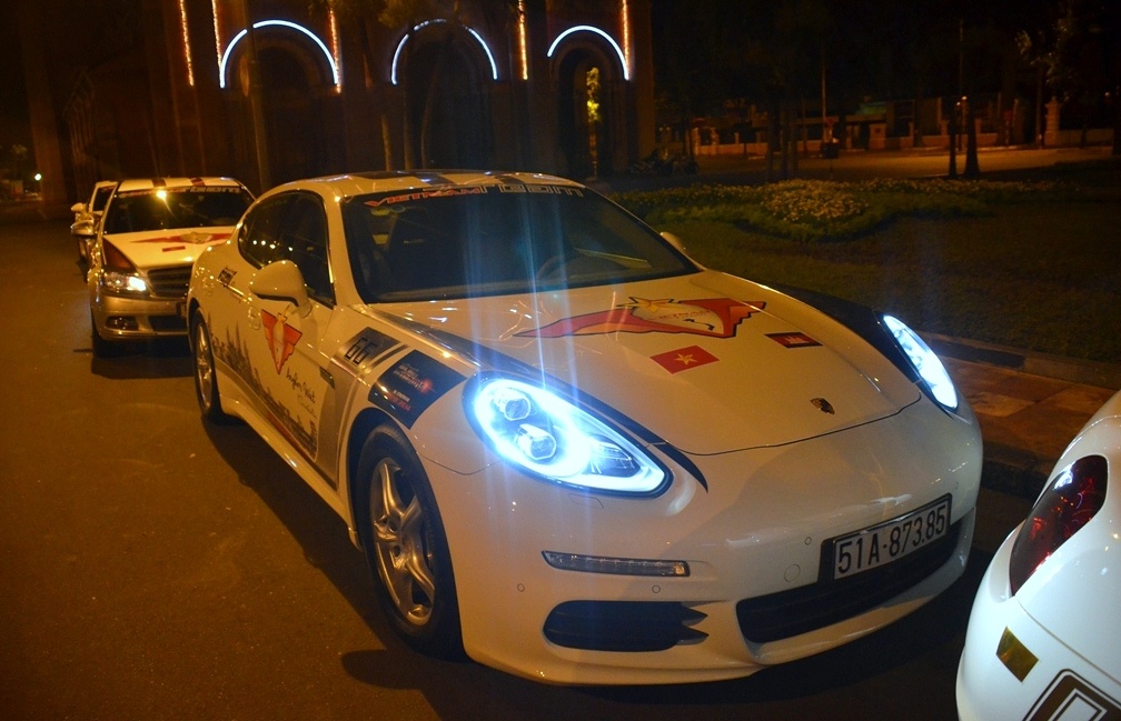 | Vì điều kiện đường sá bên Campuchia không thích hợp với những siêu xe gầm thấp nên hành trình lần này chủ yếu xuất hiện xe sang. Trong hình là chiếc Porsche Panamera màu trắng, được dán decal đẹp mắt. |