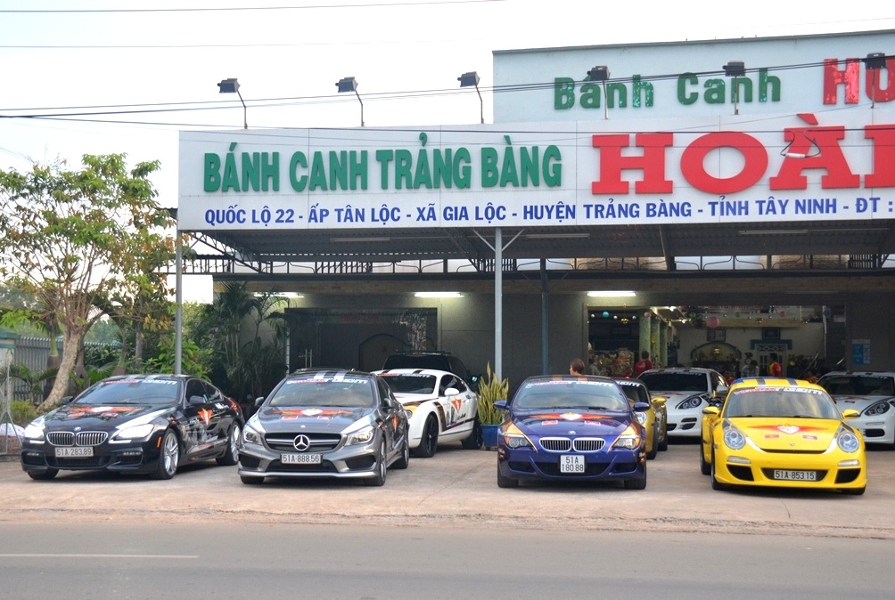 | Đầu giờ sáng thì tới địa phận huyện Trảng Bàng, tỉnh Tây Ninh. Cả đoàn dừng chân nghỉ giữa chặng, những chiếc xe sang được xếp ngay ngắn bên cạnh Quốc lộ 22. |
