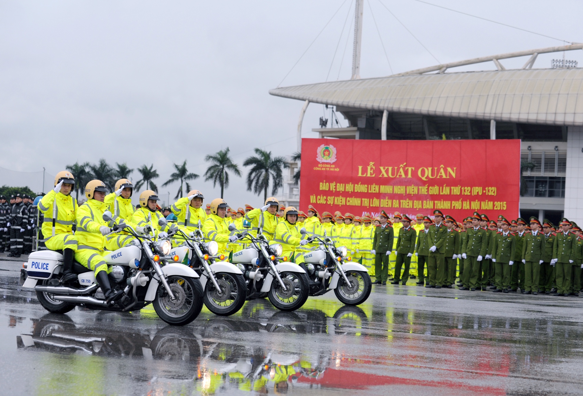 Chiều 24/3, Công an Hà Nội chủ trì cùng các đơn vị liên quan tổ chức Lễ xuất quân bảo vệ Đại hội đồng Liên minh Nghị viện thế giới lần thứ 132 (IPU 132 từ 28/3 đến 1/4). Nổi bật tại buổi lễ là màn biểu dương lực lượng, phương tiện, trang thiết bị kỹ thuật của các lực lượng tham gia bảo vệ. Trong ảnh là dàn môtô đặc chủng của CSGT phục vụ công tác tuần tra, dẫn đoàn, dung tích 750 cc.