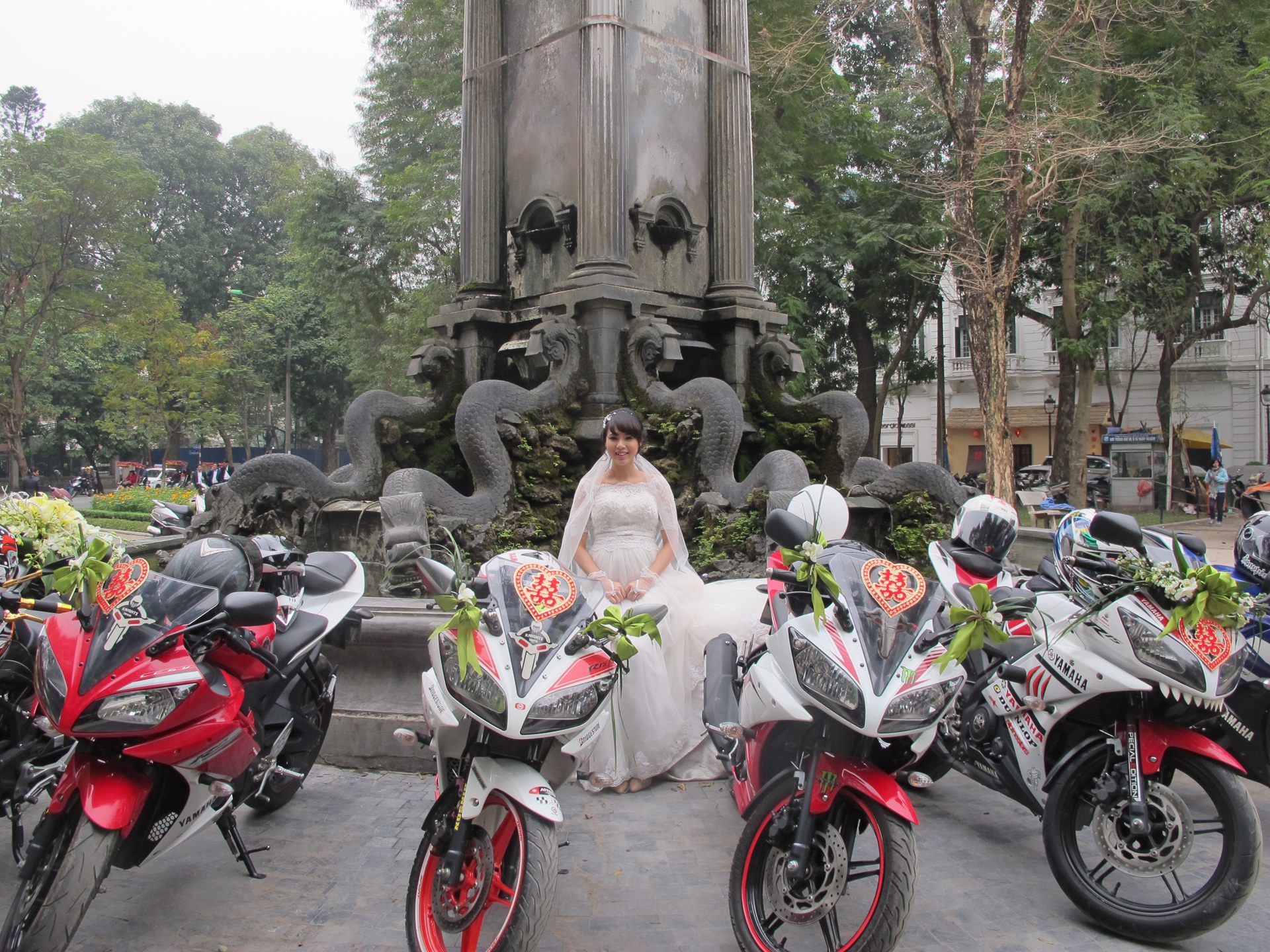 | Chú rể và cô dâu đã cùng rong ruôi qua nhiều địa điểm nổi tiếng tại Hà Nội trên chiếc xe cào cào, với sự hộ tống của những người bạn đi Yamaha R15. |