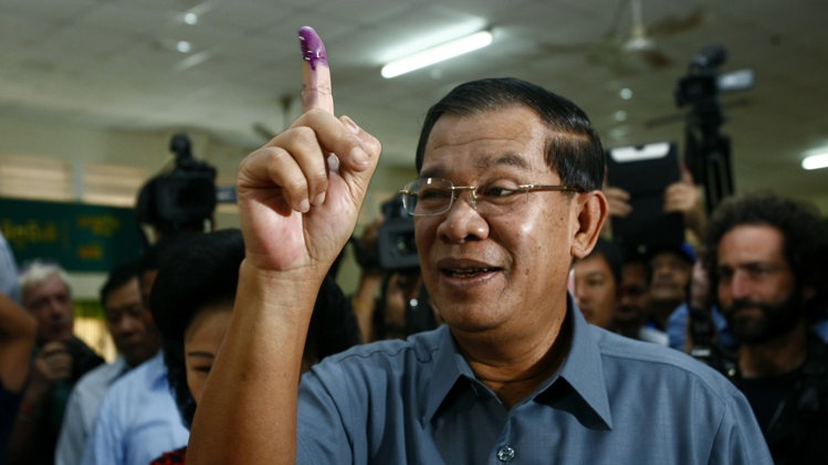 | Thủ tướng Hun Sen giơ ngón tay sau khi bỏ phiếu tại thủ đô Phnom Penh vào ngày 28/7. Ảnh: AP. |