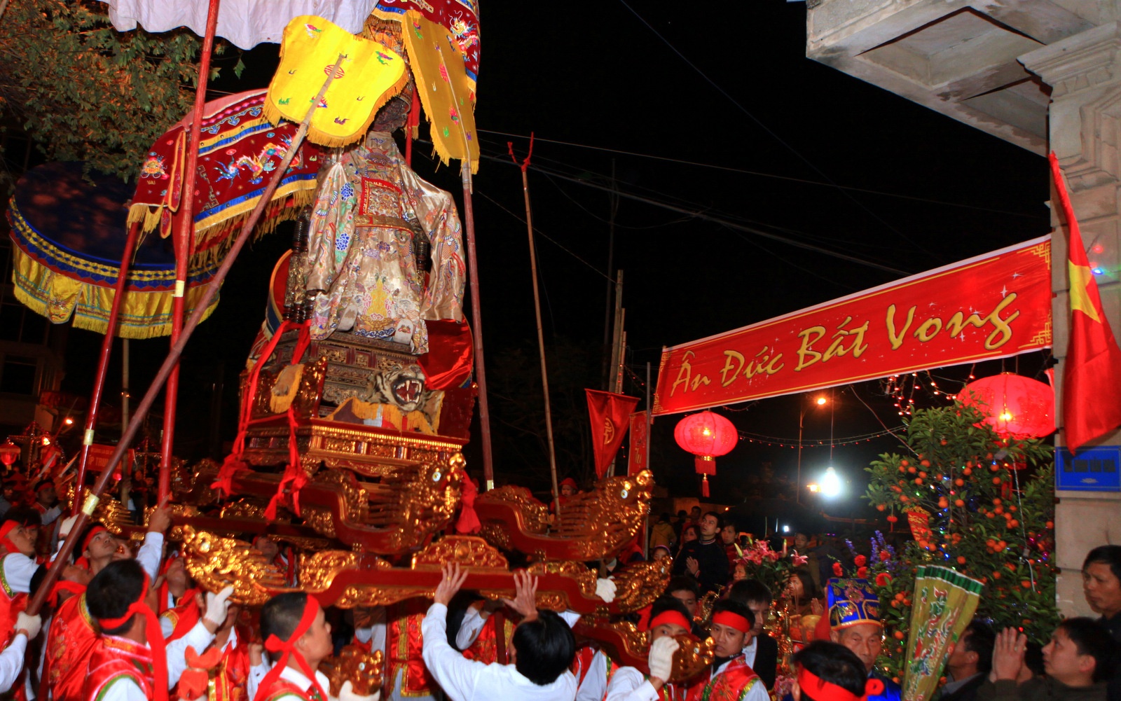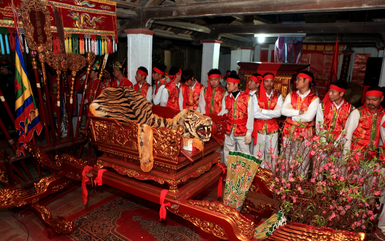 Đây là nghi lễ dâng tế người có công giết hổ và được tôn làm Thành hoàng làng năm xưa. 16 trai làng được tuyển chọn để khênh kiệu vào đình.