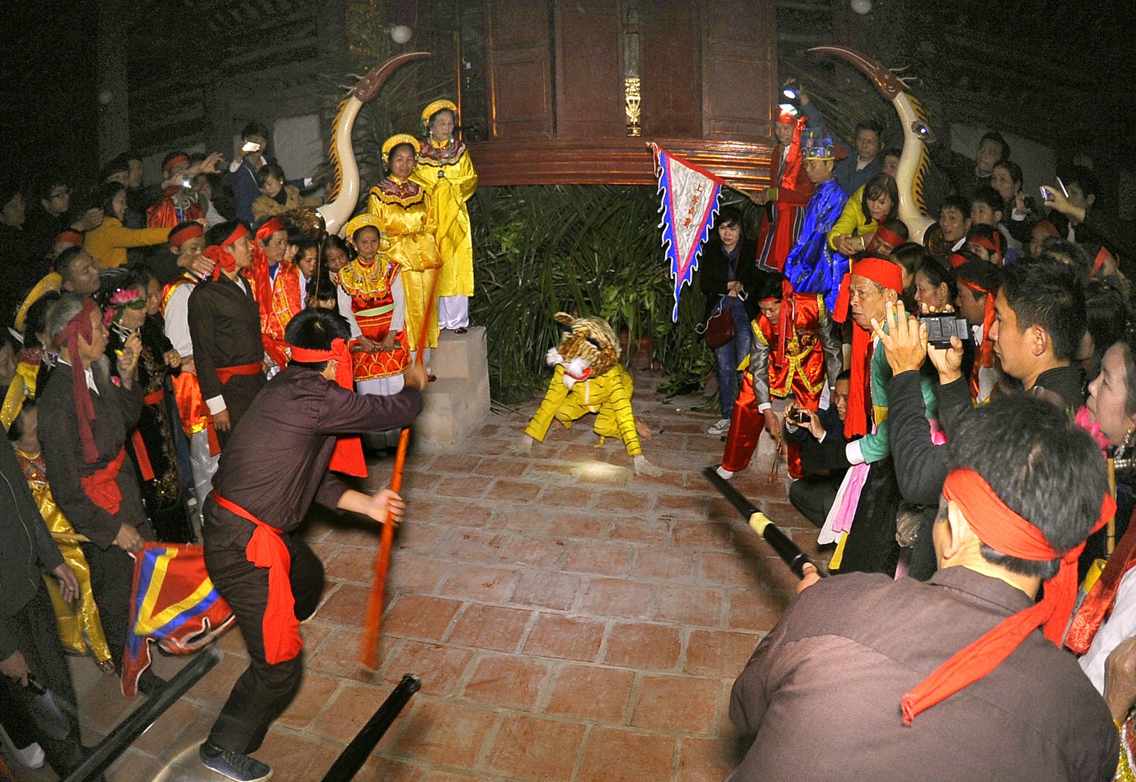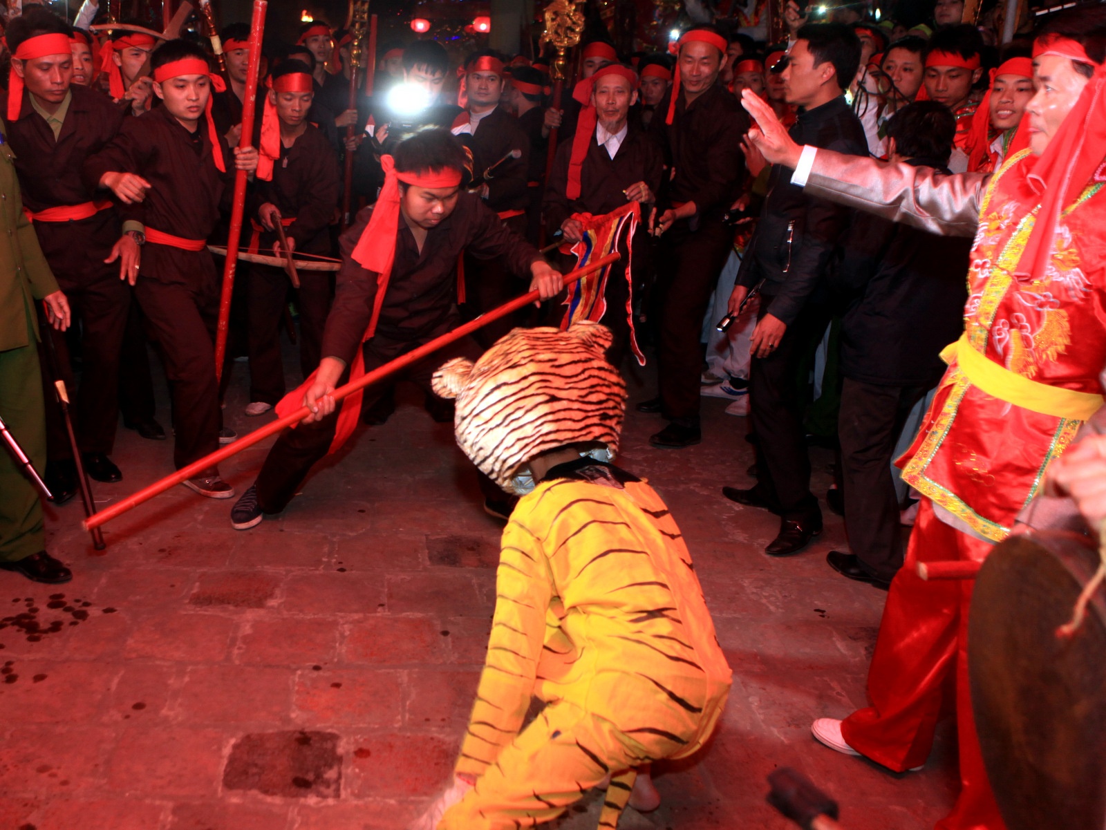 Nổi bật nhất lễ hội là màn đánh hổ. Đoàn thợ săn cùng cung tên, giáo mác và trống chiêng đi bắt tại một cánh rừng giả định giữa sân đình.