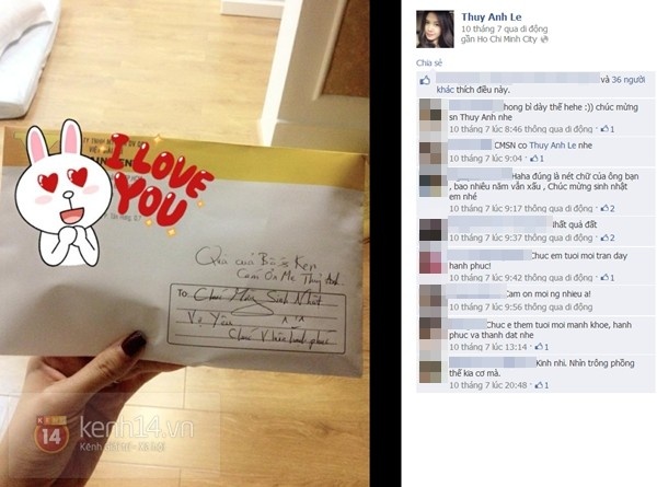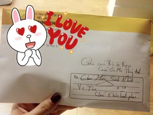 Ngoài ra, ở một hình ảnh khác, Thủy Anh khoe một phong bì với dòng chữ: "Quà của bố và Ken cảm ơn mẹ Thủy Anh. Chúc mừng sinh nhật vợ yêu. Chúc vợ luôn hạnh phúc", khi mang dòng chữ này so với chữ viết của Đăng Khôi thì nó hoàn toàn trùng khớp.