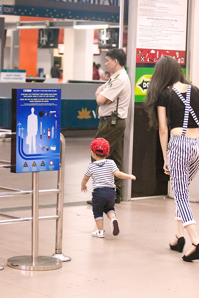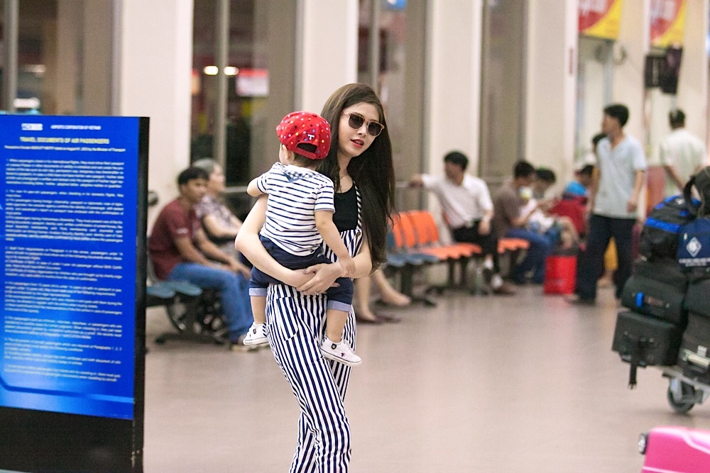 Vì lần này cả gia đình sẽ nán lại Hà Nội khá lâu và cậu nhóc Kent cũng còn khá nhỏ, cần sử dụng nhiều đồ nên hot girl Hà thành phải mang theo rất nhiều valy hành lý.