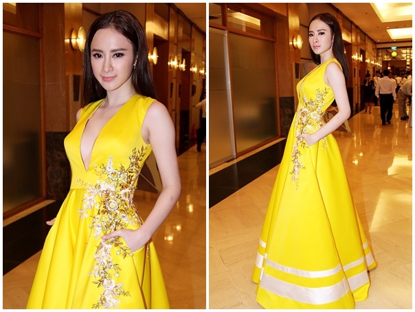 | Không kém cạnh các đàn chị, Angela Phương Trinh trưng diện mốt váy dạ hội lộng lẫy khi dự event tại TP.HCM. Bộ váy của NTK Lê Thanh Hoà không chỉ cuốn hút nhờ tông màu vàng rực rỡ, điểm nhấn thêu hoa tinh tế mà còn tạo sự hấp dẫn với điểm nhấn cổ chữ V xẻ sâu, phát huy lợi thế sexy táo bạo của "bà mẹ nhí". |