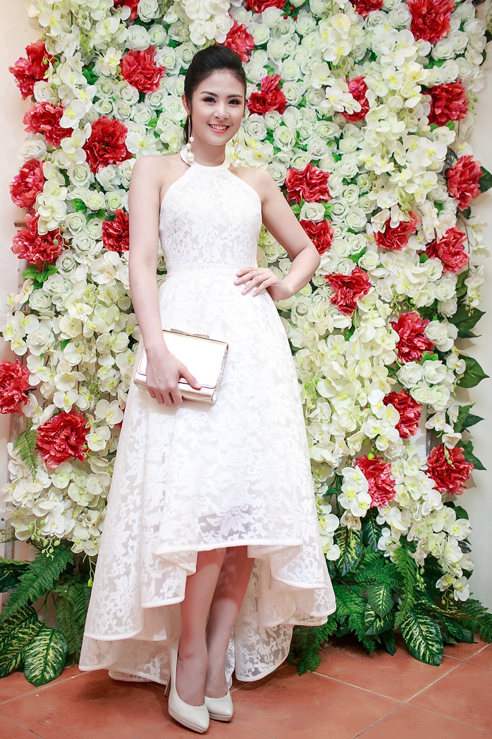 | Hoa hậu Ngọc Hân chọn phong cách thanh lịch, nền nã khi dự buổi tiệc khai trương tại Hà Nội. Bộ váy chất ren dáng mullet nhẹ nhàng phù hợp với hình ảnh nữ tính vốn có. Cách mix phụ kiện hoa tai hạt ngọc trai, túi clutch và giày đồng gam trang phục thể hiện khả năng mix&match tinh tế của người mặc. |