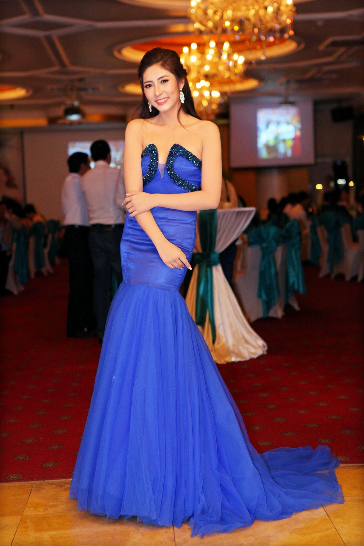| Tối 22/11, Hoa hậu đại dương tổ chức tiệc mừng sinh nhật tại TP HCM. Đông đảo bạn bè, đồng nghiệp đến chúc mừng người đẹp bước sang tuổi 20 và những thành công đạt được trong năm 2014. Có mặt ở sảnh tiệc từ rất sớm, hoa hậu diện trang phục váy dạ hội gam xanh quyến rũ. |