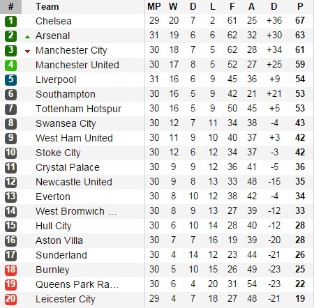 | Bảng xếp hạng vòng 31 Premier League 2014/15. |