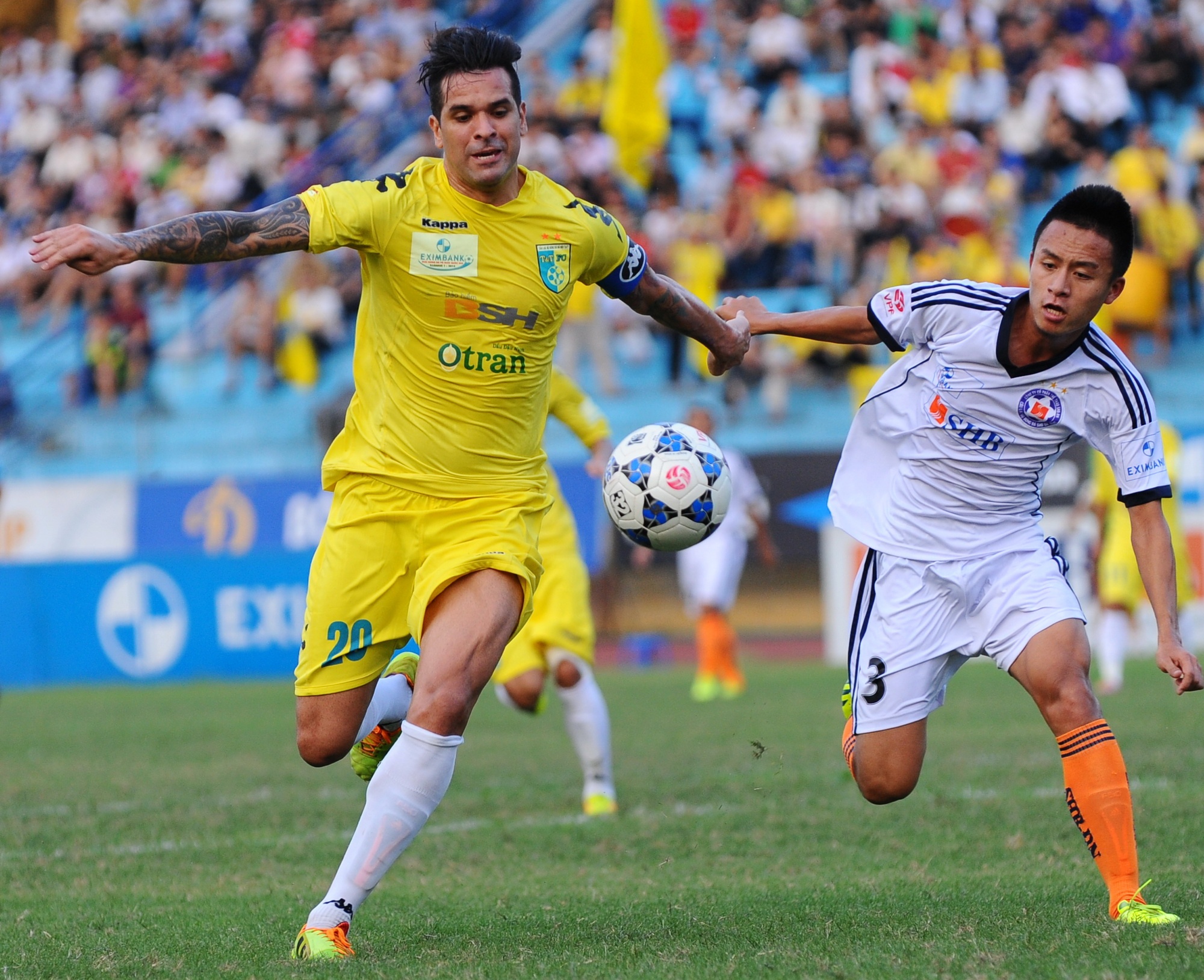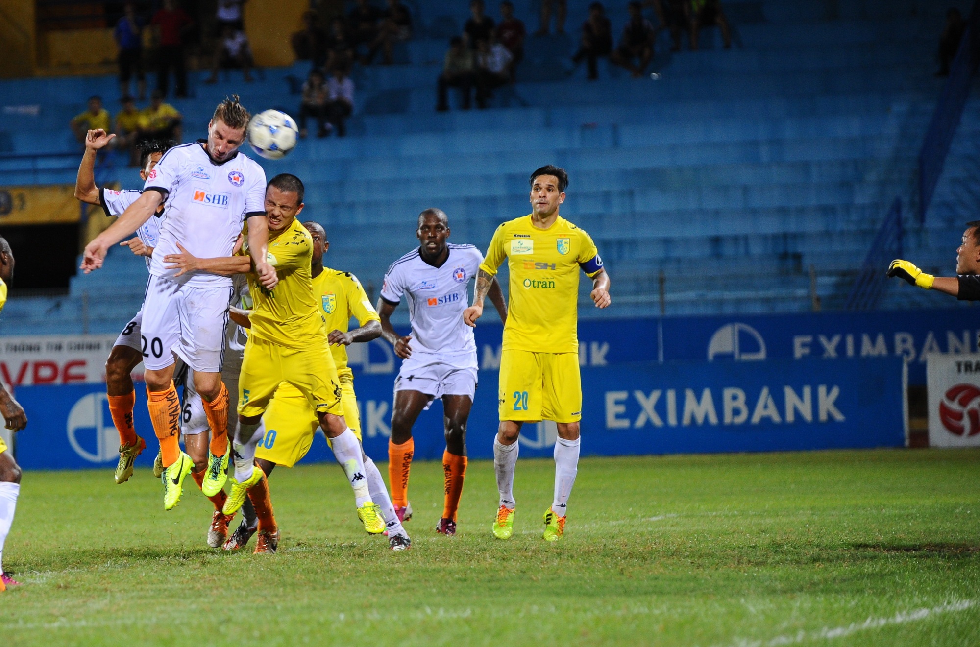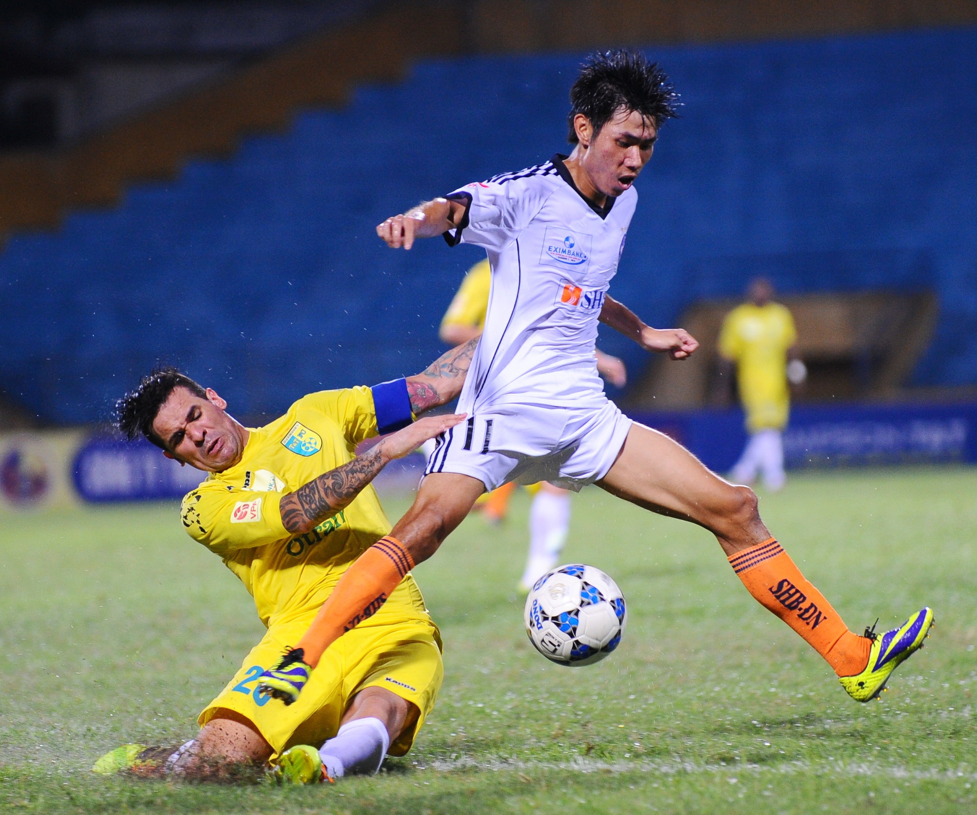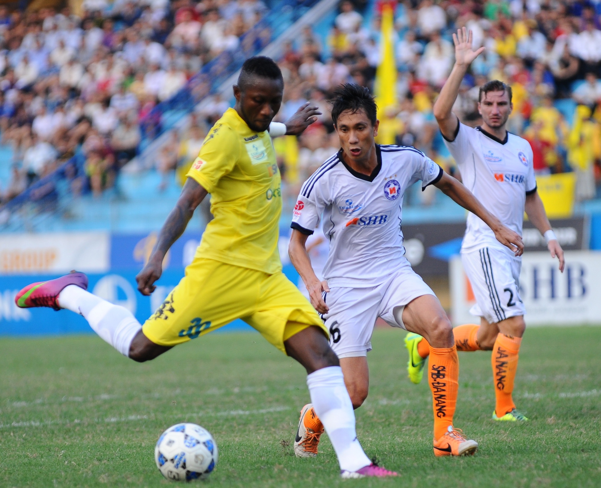 | Sau khi bị thủng lưới, hàng thủ SHB Đà Năng chơi có phần tập trung hơn nhưng vẫn phải rất vất vả chống lại sức càn lượt của 2 ngoại binh Samson và Gonzalo bên phía đội chủ nhà. Ảnh: Samson đi bóng tốc độ qua 2 cầu thủ của SHB Đà Nẵng nhưng đáng tiếc cú dứt điểm lại đưa bóng đi sát sạt cột dọc. |