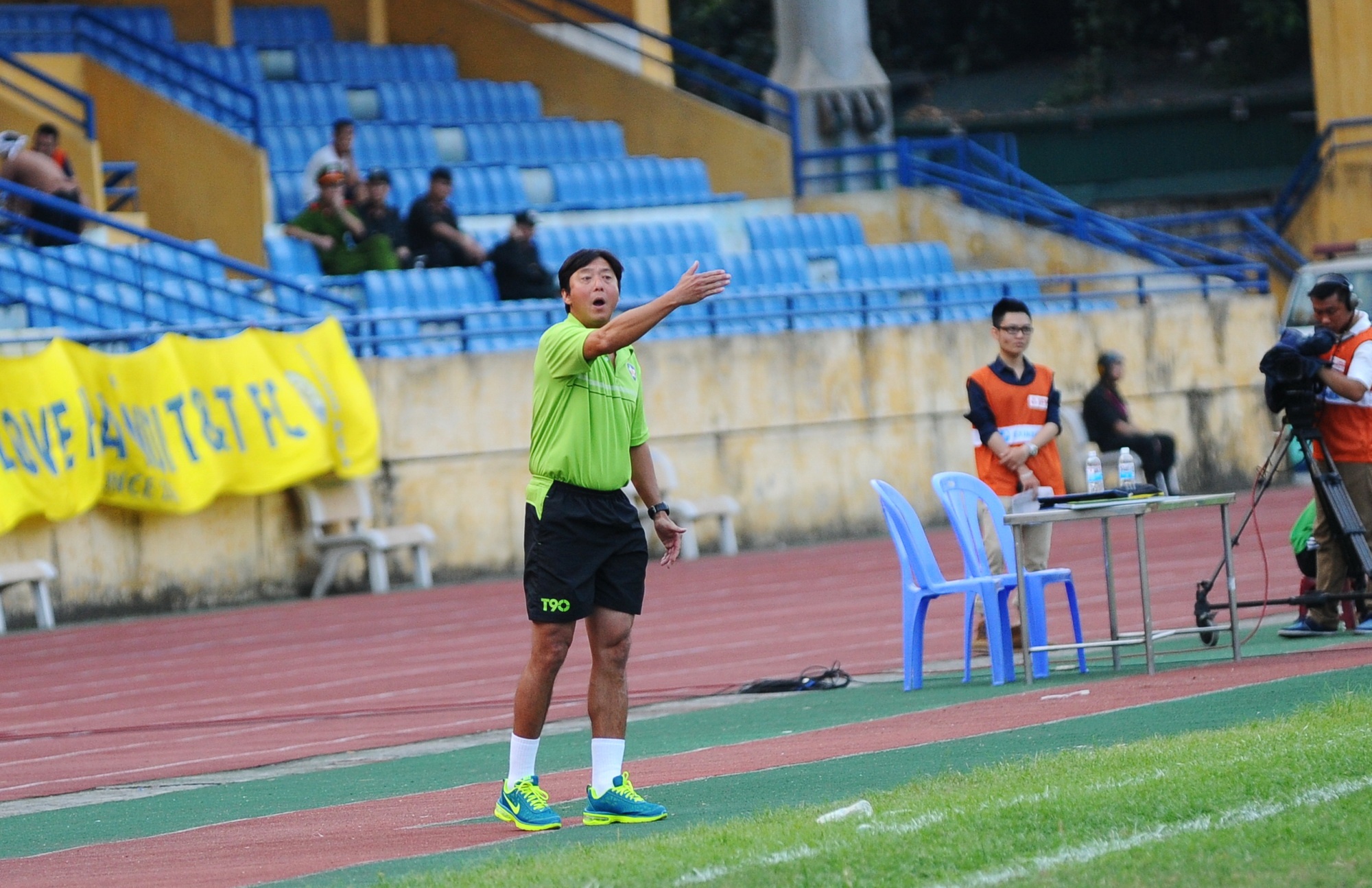 | Bước sang hiệp 2, HLV Lê Huỳnh Đức chỉ đạo các học trò dâng cao đội hình tìm kiếm bàn gỡ. |