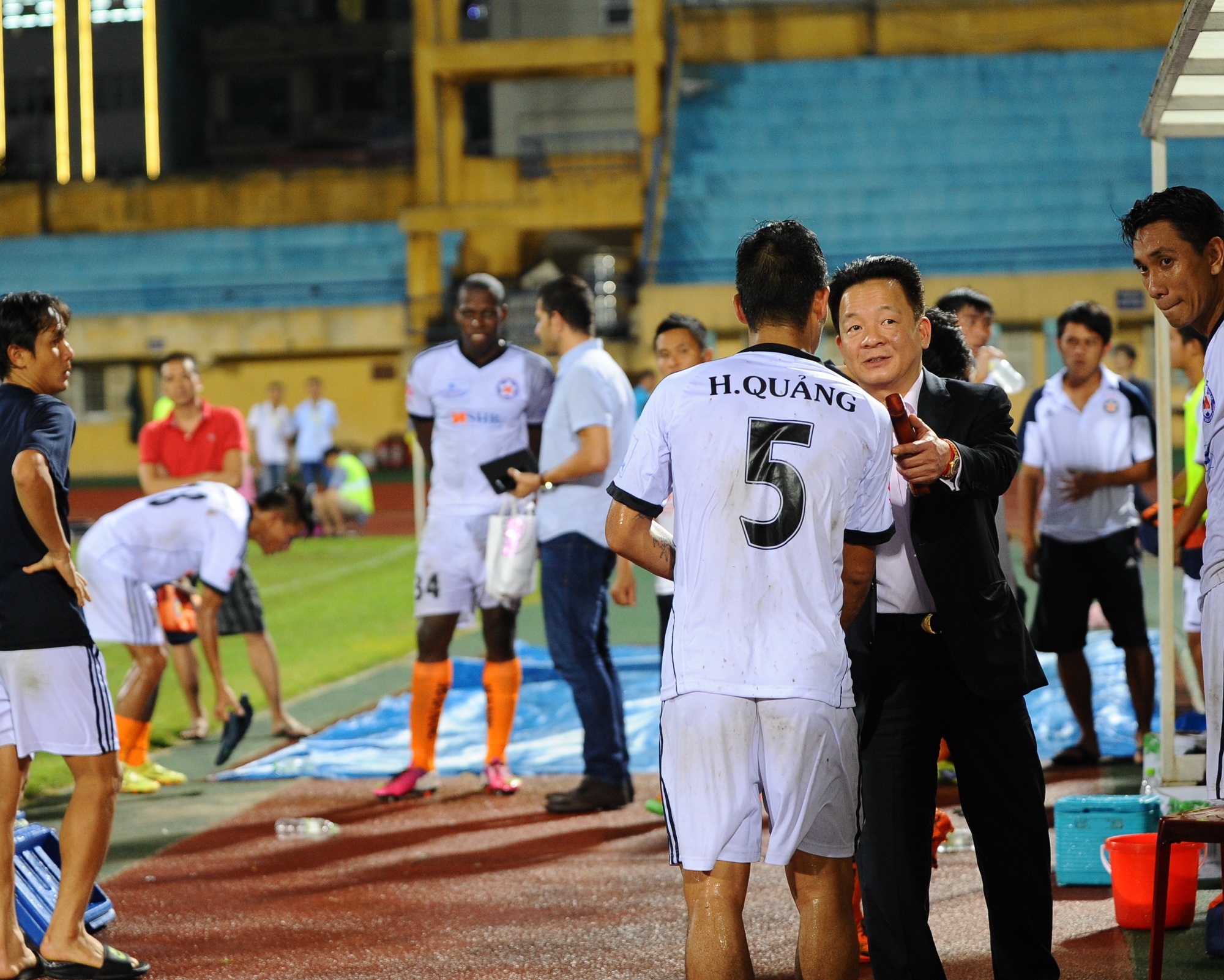 | Hà Nội T&T giành chiến thắng chung cuộc 2-0, vươn lên đầu bảng V.League 2014 do hơn hiệu số bàn thắng. Kết thúc trận đấu, bầu Hiển có mặt ở băng ghế huấn luyện đội khách động viên thầy trò HLV Lê Huỳnh Đức. |