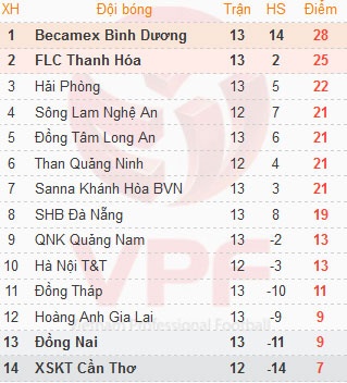 Bảng xếp hạng V.League sau khi các trận đấu sớm ở vòng 13 kết thúc.