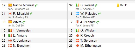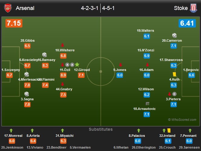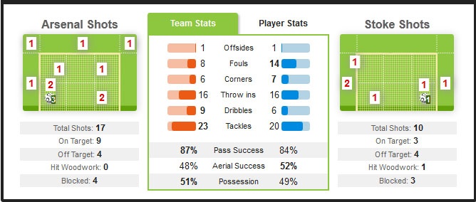 Dù nỗ lực tấn công nhằm tìm kiếm bàn thắng rút ngắn tỷ số, nhưng Stoke đã không thành công trước phong độ ấn tượng của thủ môn Szczesny. Sau 90 phút trận gặp Stoke, Arsenal thu về 3 điểm và leo lên vị trí số 1 trên bảng xếp hạng, nhiều hơn 2 điểm so với đội bóng xếp ngay phía sau Chelsea.
