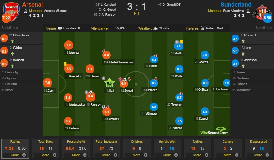 Như được cởi bỏ áp lực, đội chủ sân Emirates thi đấu rất ấn tượng trong những phút còn lại và có thêm bàn thắng ấn định tỷ số 3-1 ở phút bù giờ của Ramsey. Đánh bại Sunderland, đoàn quân của huấn luyện viên Wenger vượt qua cả hai đội bóng thành Manchester để leo lên vị trí thứ hai, kém Leicester 2 điểm.