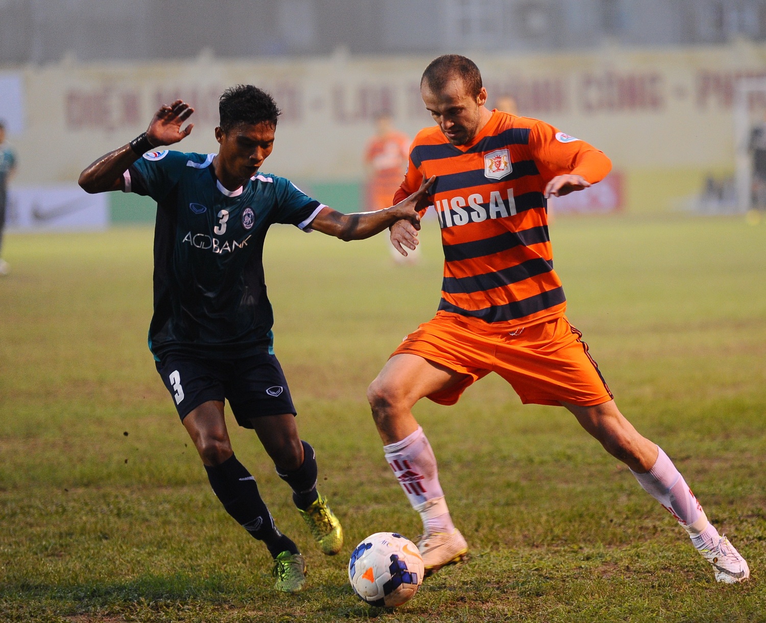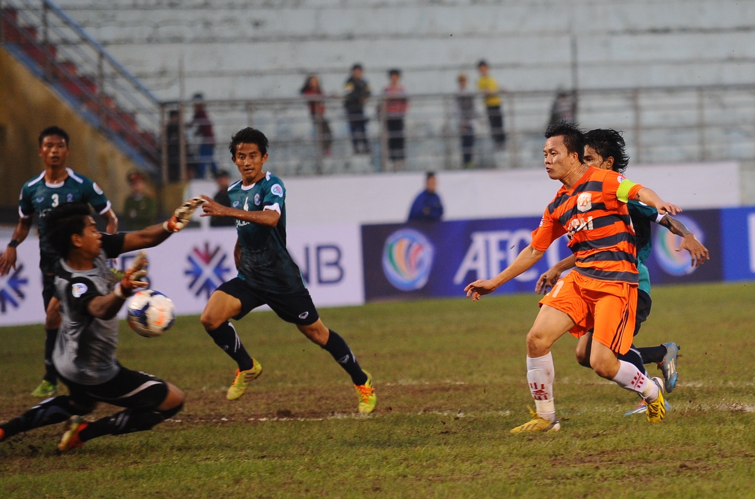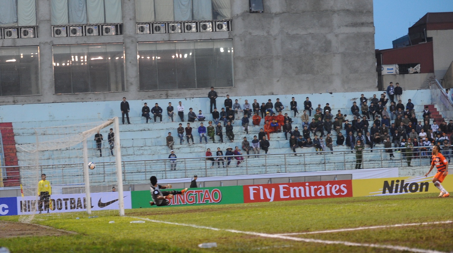 | Mạnh Dũng trong một tình huống đột phá xuất sắc từ vị trí giữa sân, tuy nhiên anh không đánh bại được thủ môn Aung Wai. Phút 16, Voinea Petrisor đánh đầu cận thành nâng tỷ số lên 2-0 cho đội chủ nhà từ đường chuyền của Patiyo |