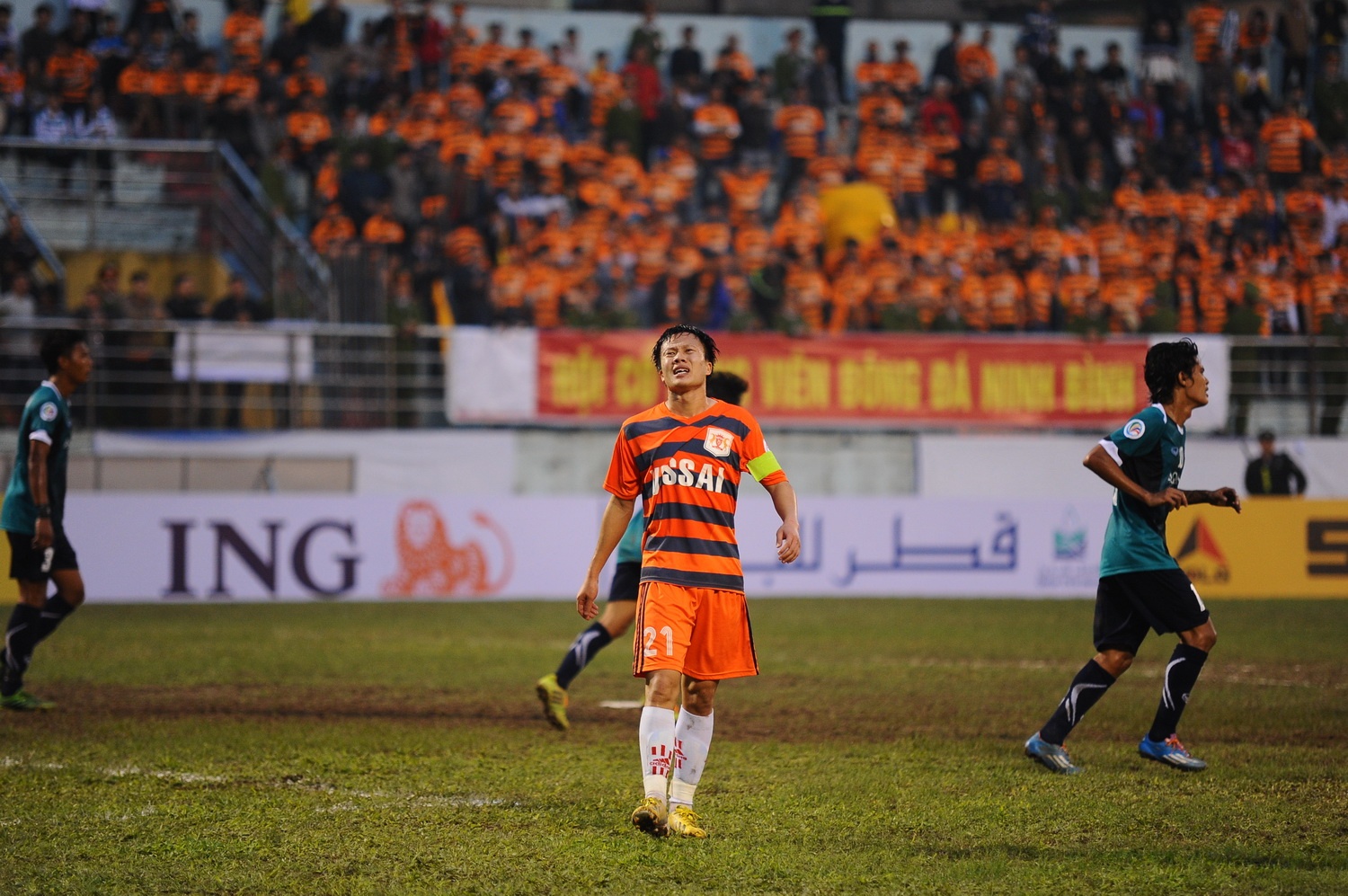 | Sự tiếc nuối của đội trưởng bên phía Ninh Bình. Phút 27, Yangon United có bàn gỡ 1-2 do công của của Cezar Augusto. |